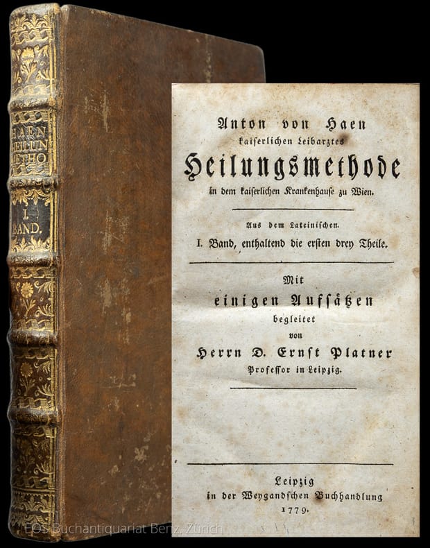 De Haën (1704-1776) war Schüler von Boerhaave und arbeitete mit Van Swieten zusammen bevor er 1756 Professor in Wien wurde. Obwohl er in seinen Schriften immer wieder die Erfolge der Magie und die Existenz der Geister beschreibt, führte er gleichzeitig das Thermometer in Wien ein. – Papier durchgehend etwas stockfleckig. Der Einband berieben.