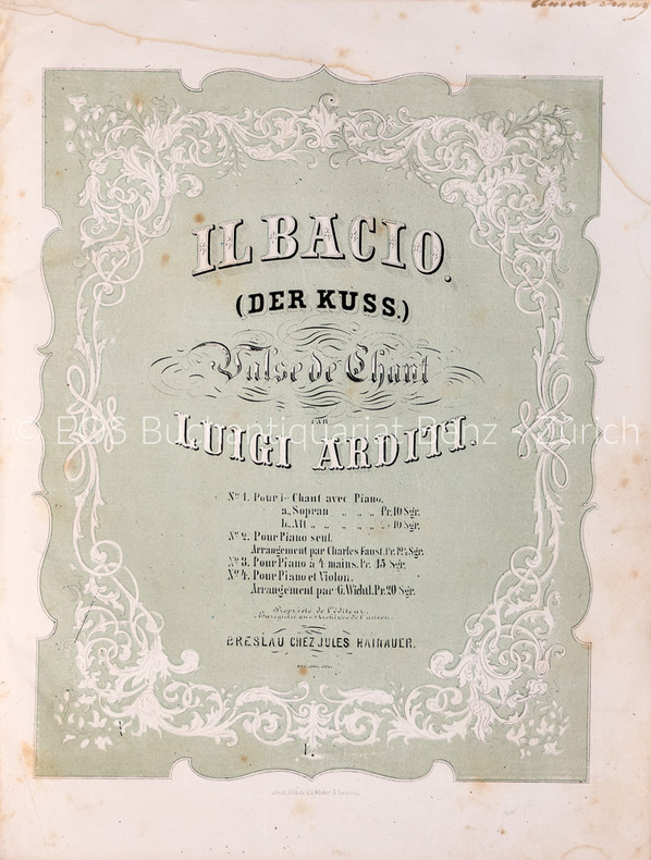 Enthalten sind: Oesten, Theodor: Klänge der Liebe, Op. 50. Achte Auflage. Magdeburg, Heinrichshofen'schen Musikalien-Handlung. 7 S. Nr. 6 Alpenlieder, erleichtert ohne Octavenspannung. Platten-Nr. H. M. 1765. – Arditi, Luigi: Il Bacio (Der Kuss.) Breslau, Hainauer. 7 S. gestochene Noten. –Goetschy, J.: l'espoir du retour. Caprice pour piano. 9 S. Op. 120. Platten-Nr. 17822. – Cramer, Henri: Potpourris élégants sur des motifs d'Opéras favoris pour le piano. Offenbach, Jean André. 19 S. Platten-Nr. 6640. – Papier durchgehend stockfleckig, mit einigen Besitzereinträgen und einem Stempel.