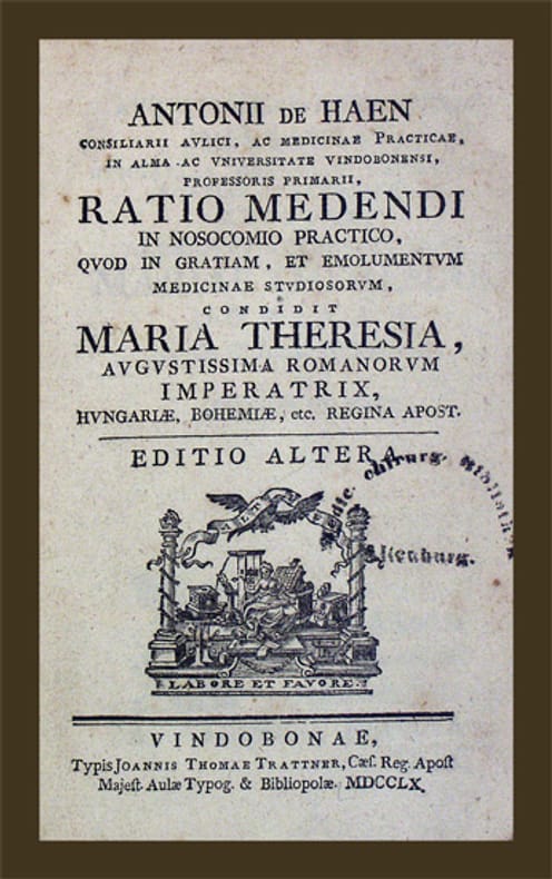 Hirsch III, 9. - Blake 192. - Wellcome III, 189. - Garrison-M. 3878. - Band eins und zwei in zweiter Auflage, Band drei, fünf und sechs in dritter Auflage, Rest in erster Ausgabe. Ohne den 1773 erschienenen 15. Band. De Haën (1704-1776) war Schüler von Boerhaave und arbeitete mit Van Swieten zusammen bevor er 1756 Professor in Wien wurde. Obwohl er in seinen Schriften immer wieder die Erfolge der Magie und die Existenz der Geister beschreibt, führte er gleichzeitig das Thermometer in Wien ein. Das vorliegende Hauptwerk ist eine Sammlung von Fallgeschichten aus seiner Erfahrung an der Wiener Klinik. Sie gibt eine Übersicht über das gesamte klinische Wissen seiner Zeit. In Band sechs Seite 284 "Haen mentioned amenorrhoea in connection with pituitary tumour" (Garrison-M.). - Umschlag des ersten Bandes beschädigt.