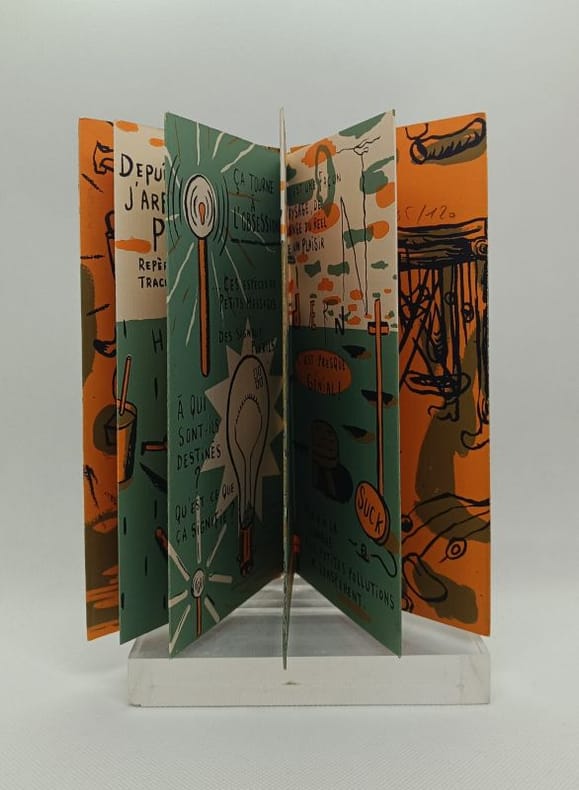 Édition CBO. ca.1999. Imprimé en sérigraphie à la manière d'un Leporello. Couverture souple, illustrée. Illustrations reproduites en couleurs. Dim: 208 x 110 mm. Non paginé. Tiré à 120 exemplaires.