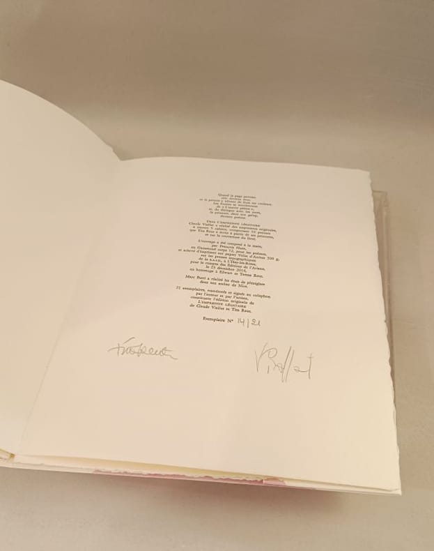 Chaque tirage de cette édition est unique, semblables mais pas identiques. Les empreintes originales réalisées par Claude Viallat pour cette édition de 21 livres sont toutes différentes.