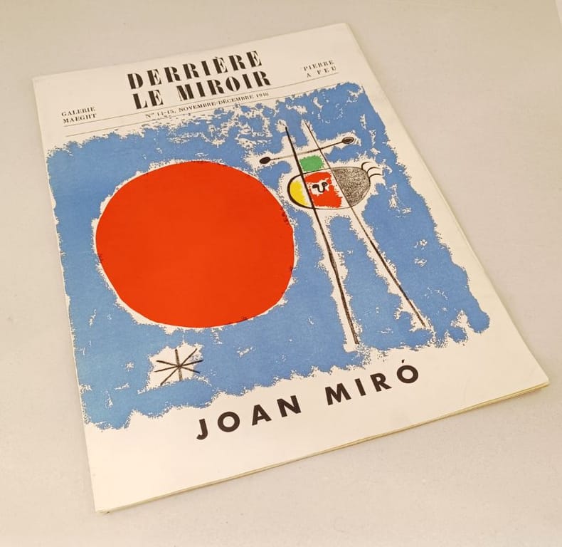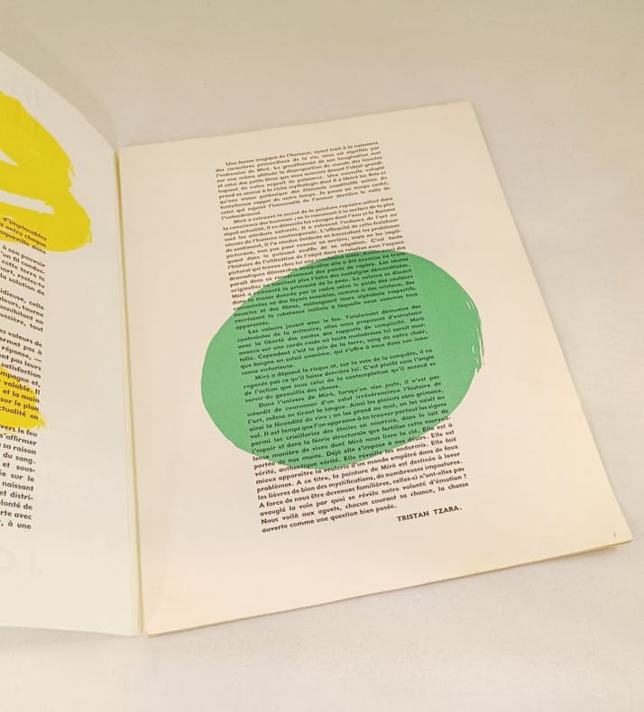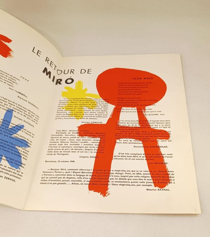 Maeght éditeur & Éditions Pierre à Feu, Paris. Imp. Blanchard, Paris. 1948. Couverture souple, illustrée. En feuilles, illustrée de 8 lithographies originales en couleurs in-texte de Joan Miro. Textes de Tristan Tzara, Jean Cassou, Raymond Queneau, Paul Eluard, Ernest Hemingway, C. Zervos, G. Limbour, R. Desnos. Dim: 378 x 280 mm. 12p. Une petite restauration sinon très bon état.