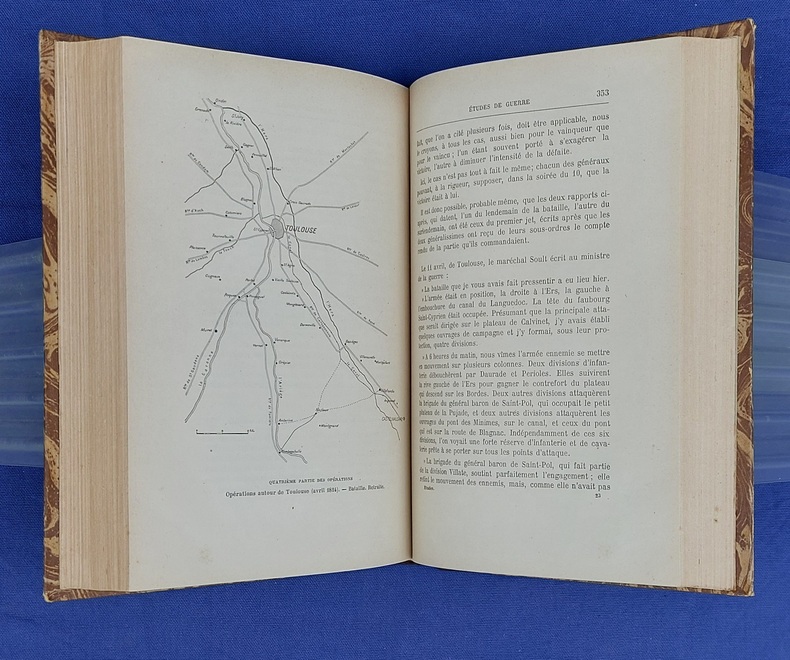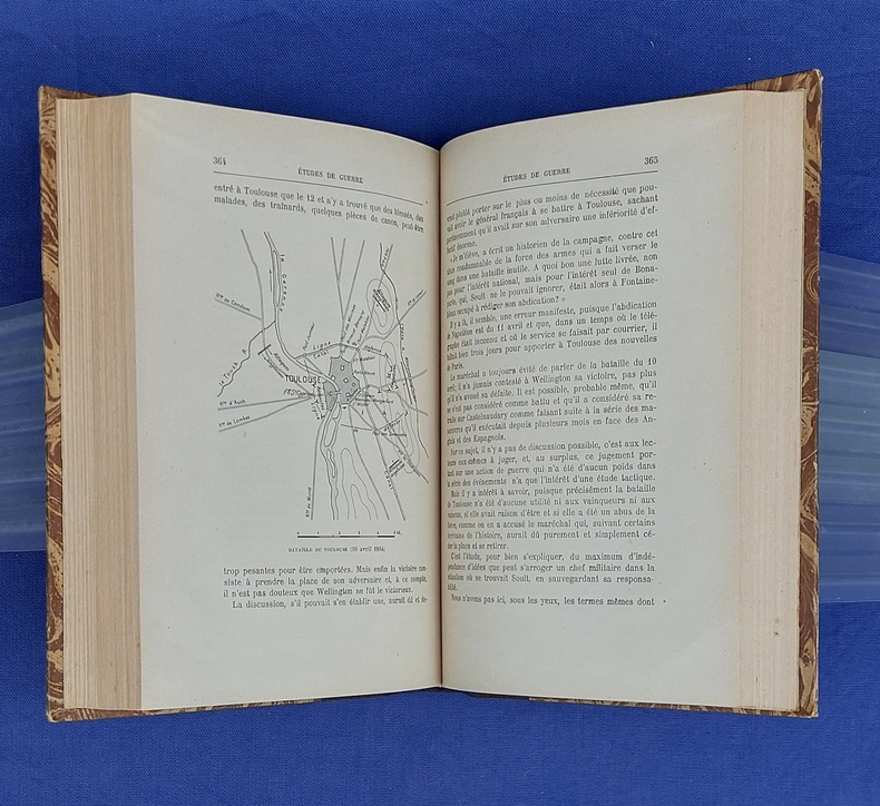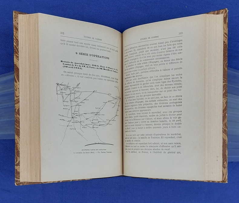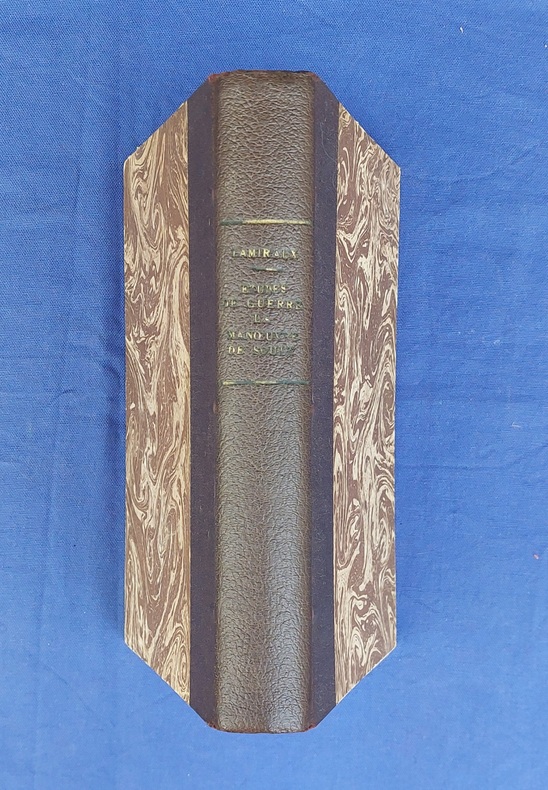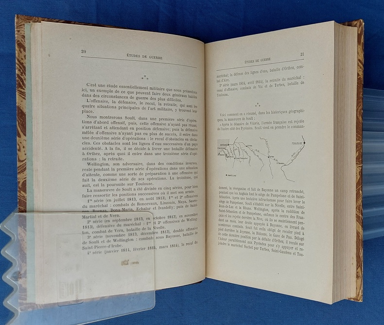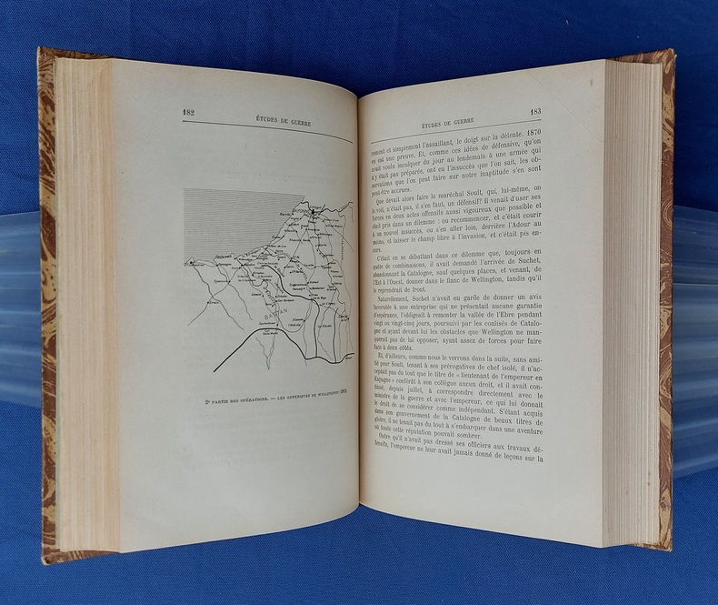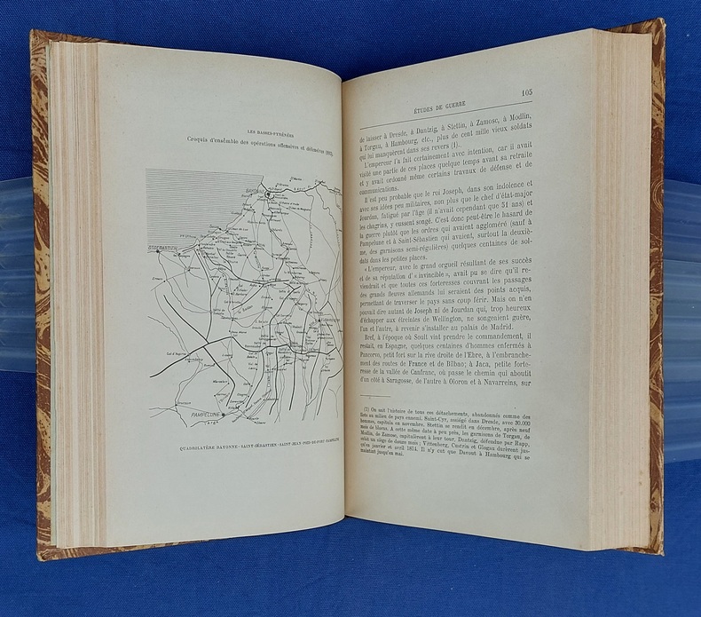 Paris et Limoges, Henri Charles-Lavauzelle, s.d. [1900], grand in-8, demi-toile chagrinée brune, dos lisse, titre doré : 482 pp. dont titre, 15 croquis in-texte “destinés à faciliter la lecture sur les cartes de France et d’Espagne”. Édition originale. Reliure modeste mais en bon état, cachet “Bibliothèque de Garnison” répété, petites brunissures sur les tranches, très rares rousseurs dans le texte. Le Maréchal Soult “premier manoeuvrier de l’Europe” selon Napoléon au soir de la victoire d’Austerlitz, fut envoyé en 1808, après Iéna et Eylau, en Espagne, où pendant cinq ans (1808-1812) il tint Wellington en échec (Burgos, Corogne, Ferrol, Ocana, Séville, Cadix…) ; après Bautzen, le Maréchal retourne en Espagne en 1813 et dispute à l’armée anglo-espagnole le versant nord des Pyrénées, de la Bidassoa à Toulouse. Rare étude retraçant la périlleuse manœuvre du Maréchal.