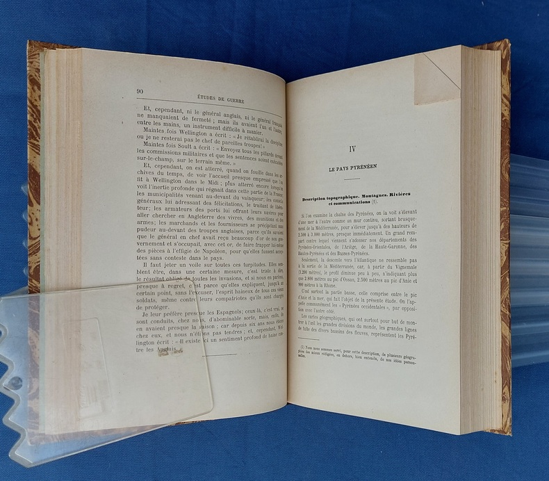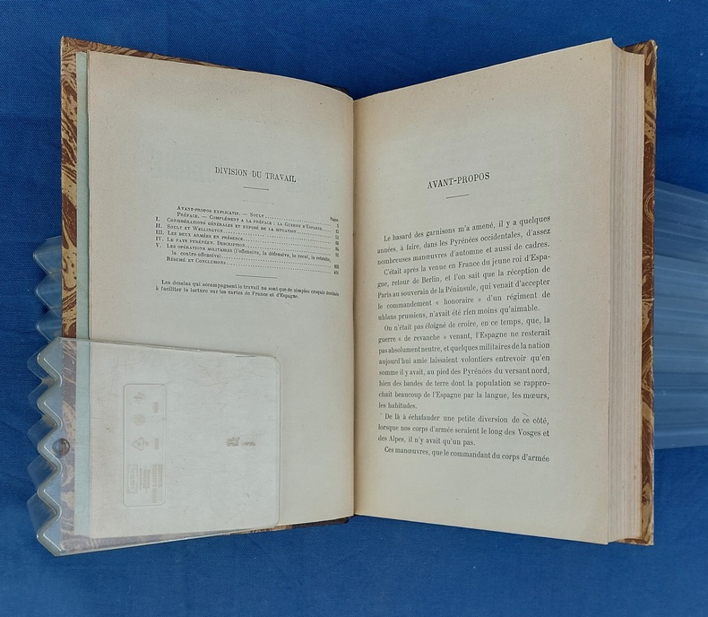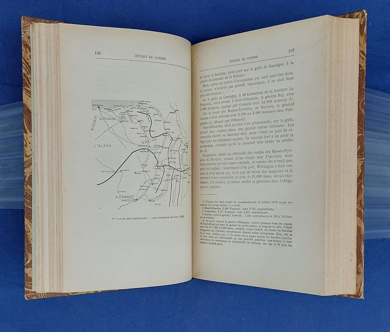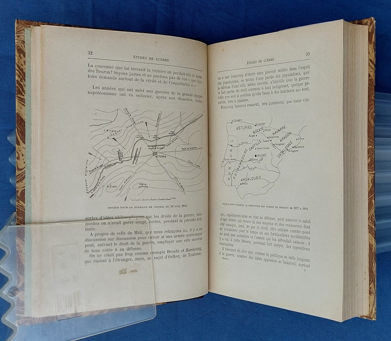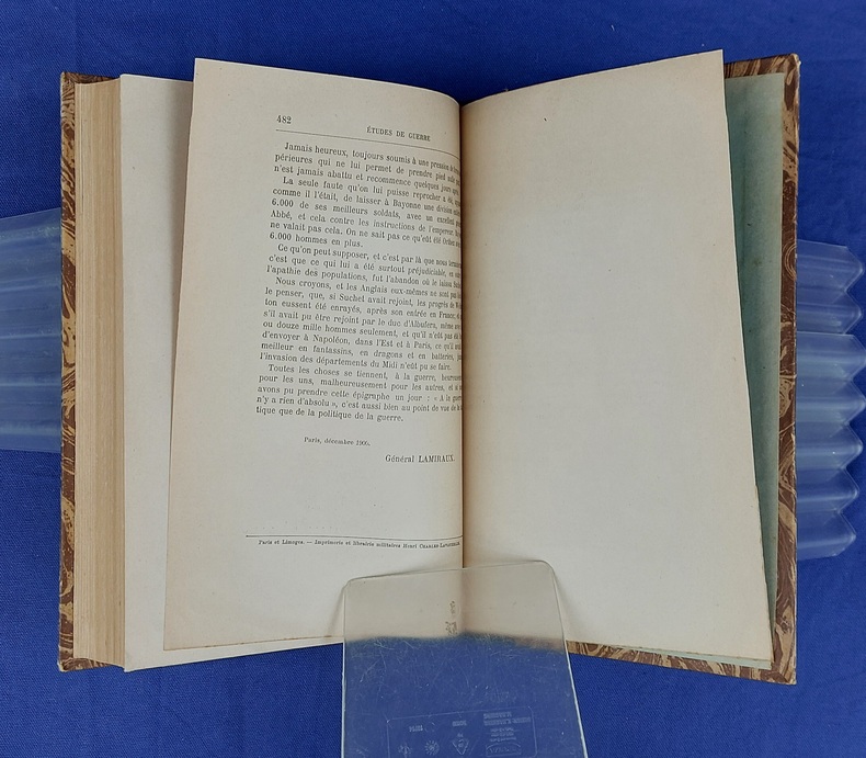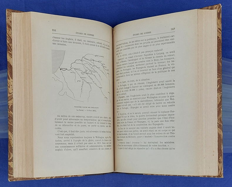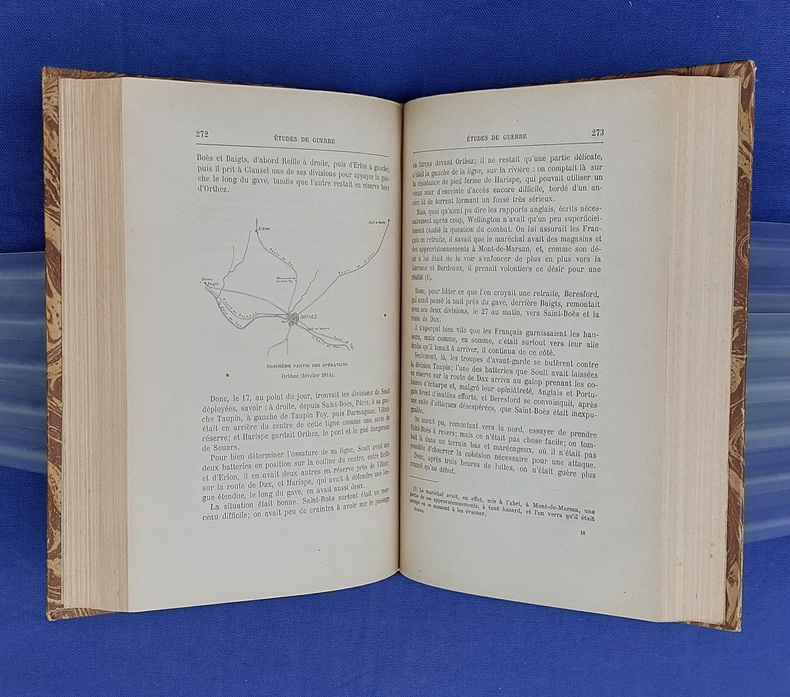 Paris et Limoges, Henri Charles-Lavauzelle, s.d. [1900], grand in-8, demi-toile chagrinée brune, dos lisse, titre doré : 482 pp. dont titre, 15 croquis in-texte “destinés à faciliter la lecture sur les cartes de France et d’Espagne”. Édition originale. Reliure modeste mais en bon état, cachet “Bibliothèque de Garnison” répété, petites brunissures sur les tranches, très rares rousseurs dans le texte. Le Maréchal Soult “premier manoeuvrier de l’Europe” selon Napoléon au soir de la victoire d’Austerlitz, fut envoyé en 1808, après Iéna et Eylau, en Espagne, où pendant cinq ans (1808-1812) il tint Wellington en échec (Burgos, Corogne, Ferrol, Ocana, Séville, Cadix…) ; après Bautzen, le Maréchal retourne en Espagne en 1813 et dispute à l’armée anglo-espagnole le versant nord des Pyrénées, de la Bidassoa à Toulouse. Rare étude retraçant la périlleuse manœuvre du Maréchal.