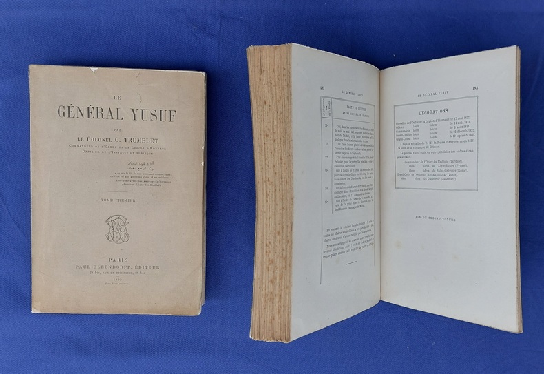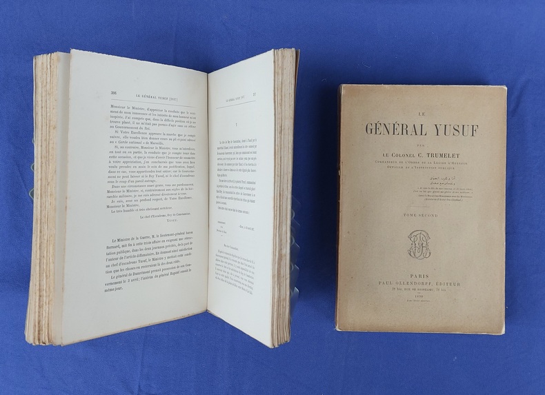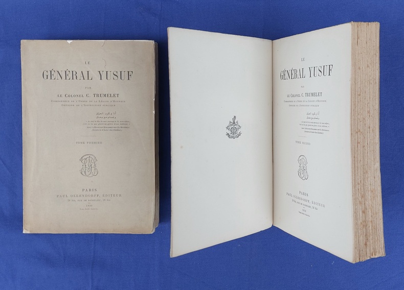 Paris, P. Ollendorff, 1890, 2 vol. in-8, broché, couvertures imprimées, 1 f. bl. - faux-titre- portrait gravé (H. Manesse) en frontispice - 545 pp. / faux-titre - page de titre - 507 pp. 1 f. bl. Édition originale. qq rousseurs claires éparses. Le Général Yusuf, “fils de mes œuvres et de mon sabre”... , eut une vie romanesque. Orphelin, né sur l'île d’Elbe durant son annexion à l’Empire français , capturé enfant par des pirates barbaresques, il rejoint le sérail de Mahmoud Bey. Il apprit le turc, l'arabe, l'espagnol, montra son adresse dans les exercices militaires, fut admis dans le corps des Mamelouks, devint l'ami du Bey. Favorable à la cause française contre l’avis du Bey et à la suite d’une intrigue amoureuse, Il quitta Tunis pour rallier la flotte française à Alger, où il fut placé comme interprète militaire avant de faire valoir ses talents militaires en Algérie pendant la conquête puis lors de la guerre de Crimée.