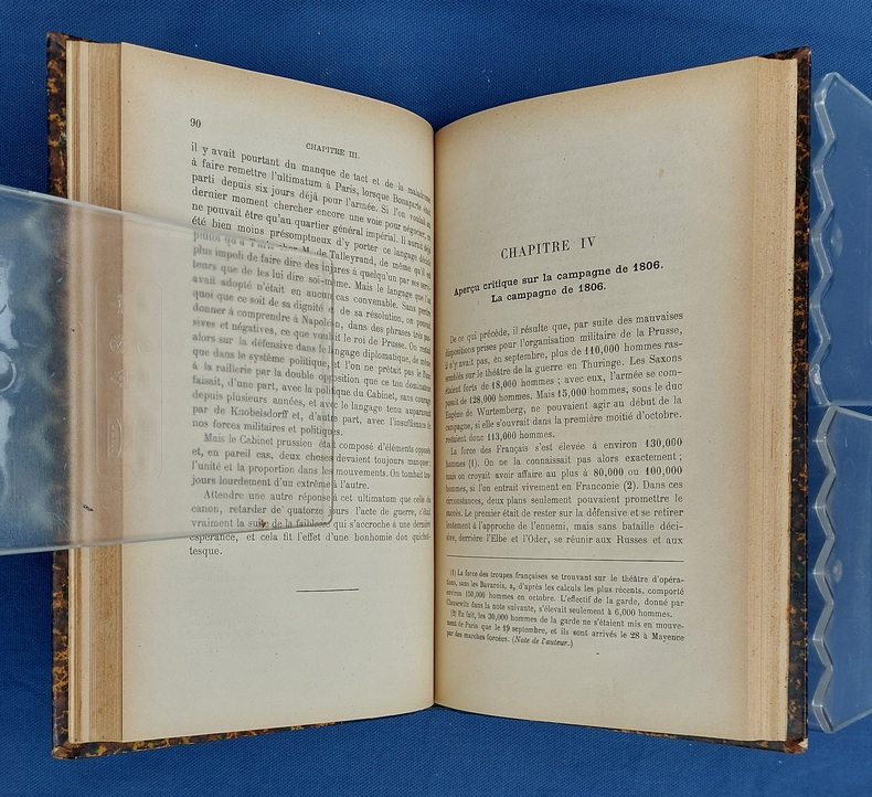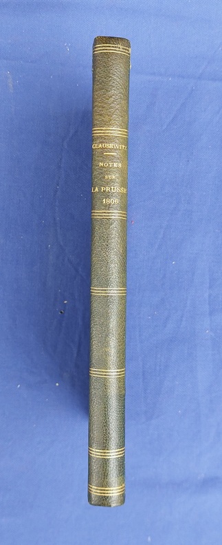 Paris, Librairie Militaire R. Chapelot, 1903, in-8 demi-chagrin vert, dos lisse à faux-nerfs orné d’un triple filet doré répété formant caisson, titre doré : faux-titre - titre - 187 pp. - 2 ff. n.c. - signet de soie verte. Édition originale de la traduction française. Dos très légèrement insolé, frottements aux mors, exempt de rousseur. Ouvrage posthume, inachevé, rédigé entre 1823 et 1827. Carl von Clausewitz (1780-1831) est un général prussien, écrivain et théoricien militaire dont les œuvres, notamment “De la guerre (en allemand : Vom Kriege)”, publiées posthumément, ont eu un impact durable sur la pensée militaire et ont été étudiées par de nombreux stratèges et leaders politiques à travers l'histoire, y compris Lénine, Mao Zedong, et des militaires contemporains. C’est en participant à plusieurs conflits majeurs, notamment les guerres de la Révolution française et les guerres napoléoniennes que Clausewitz s’est forgé son approche dialectique et sa compréhension de la guerre comme un phénomène social et politique.
