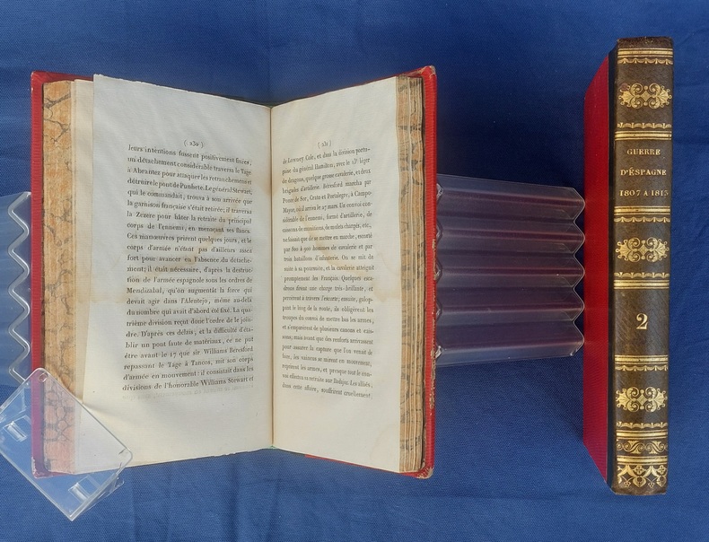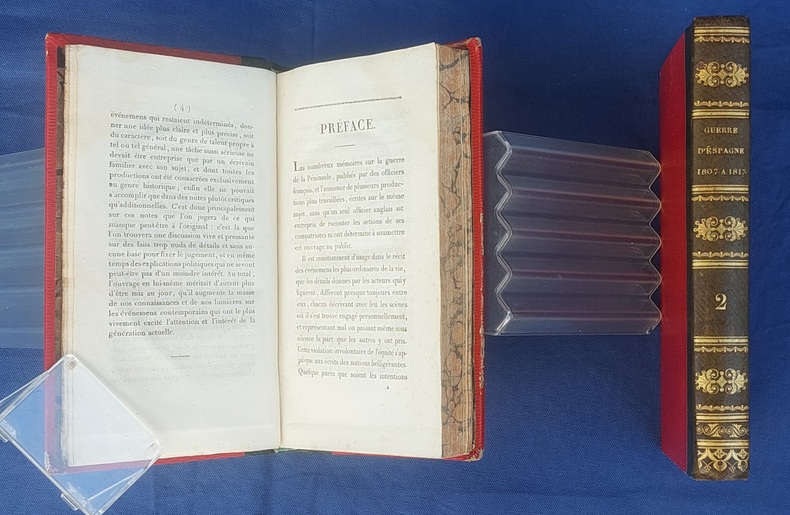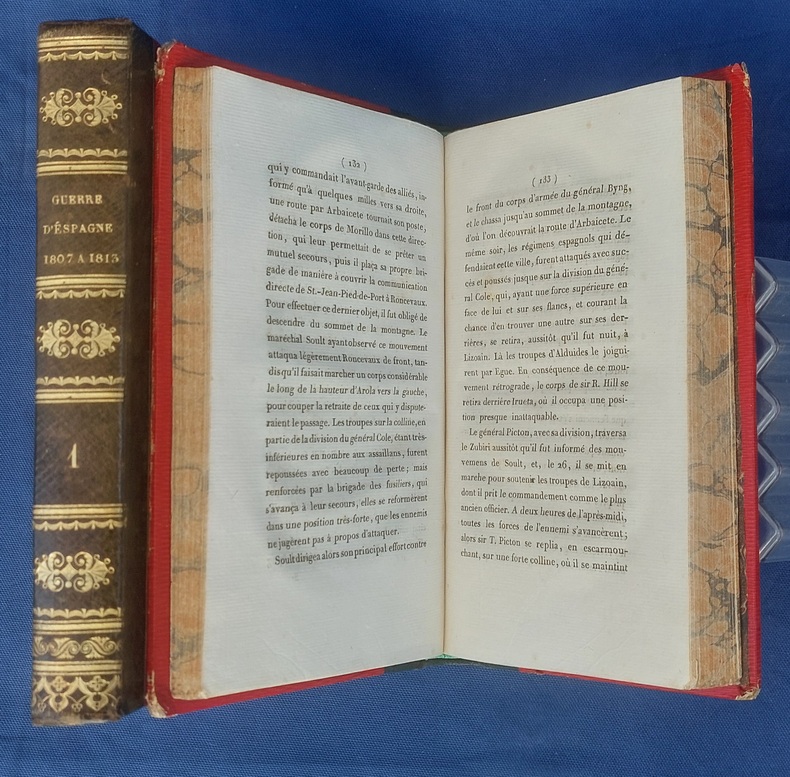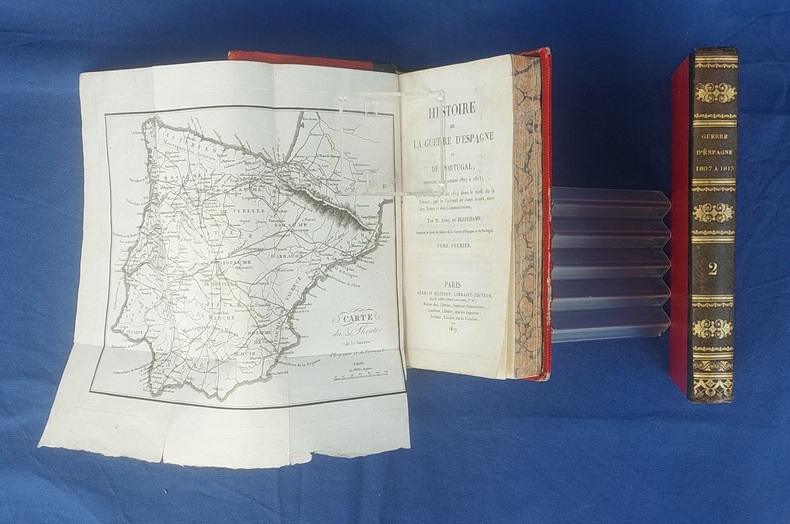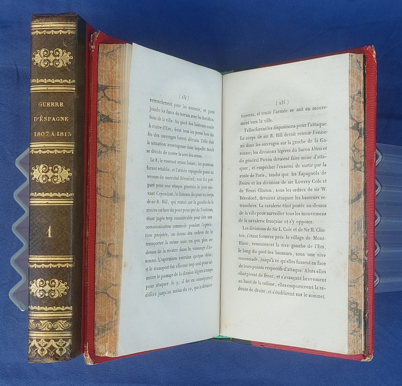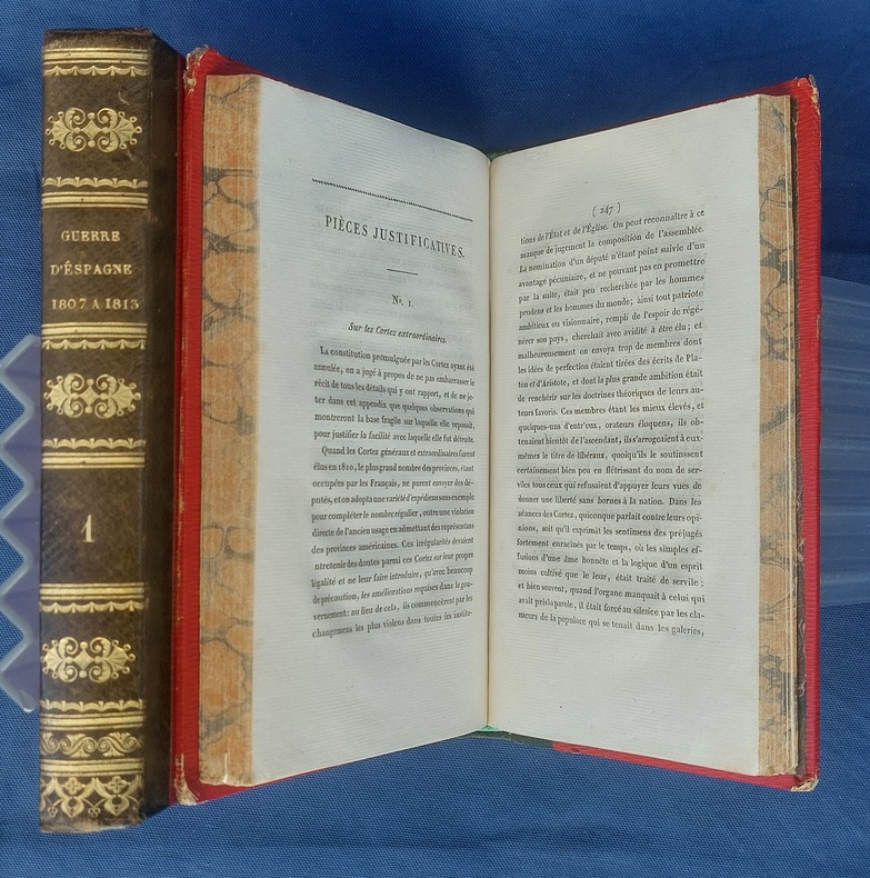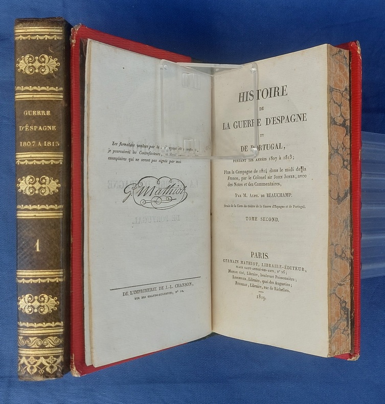 Paris, Germain Mathiot, 1819, 2 vol. in-8, demi-veau vert, dos lisse à faux nerfs richement orné, titre et tomaison dorés, papier rouge sur les plats, reliure de l’époque, tranches marbrées : 1 f. bl. suivi du faux-titre et du titre à chacun des volumes - 4 - xx - 380 - 386 pp. - Carte du théâtre de la Guerre d’Espagne et de Portugal, dépliante, placée en frontispice. Dos très légèrement passés, coins émoussés, larges mouillures claires aux deux tomes, 2 ff. de la préface (pp. xvij à xx) reliés entre les pp. 374-375. Édition originale, peu commune et non rééditée, de la traduction française annotée et commentée par M. Beauchamp, du témoignage anglais sur la Guerre d’Espagne par le major-général Sir John Thomas Jones, officier britannique du génie royal qui joua un rôle de premier plan dans plusieurs campagnes européennes du début du XIXe siècle.