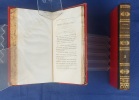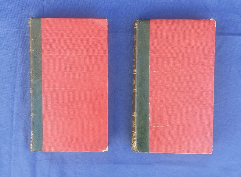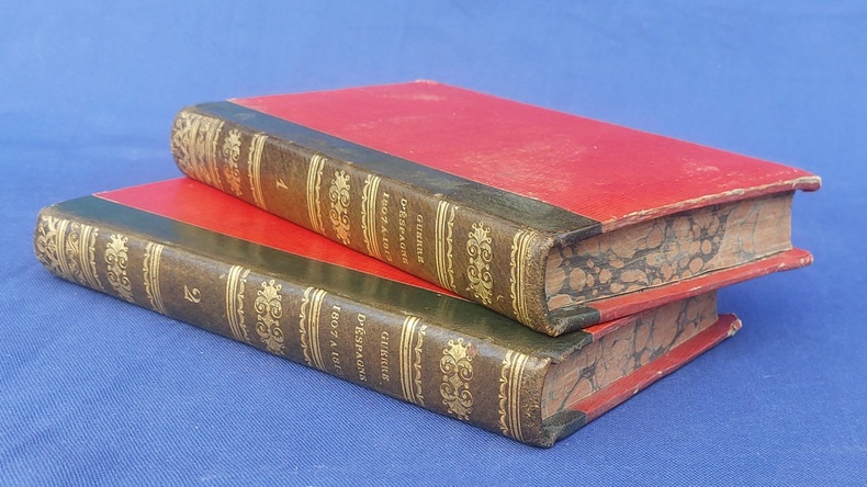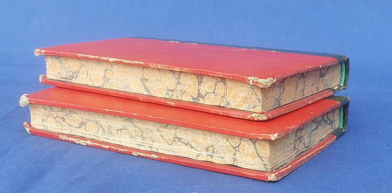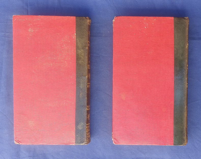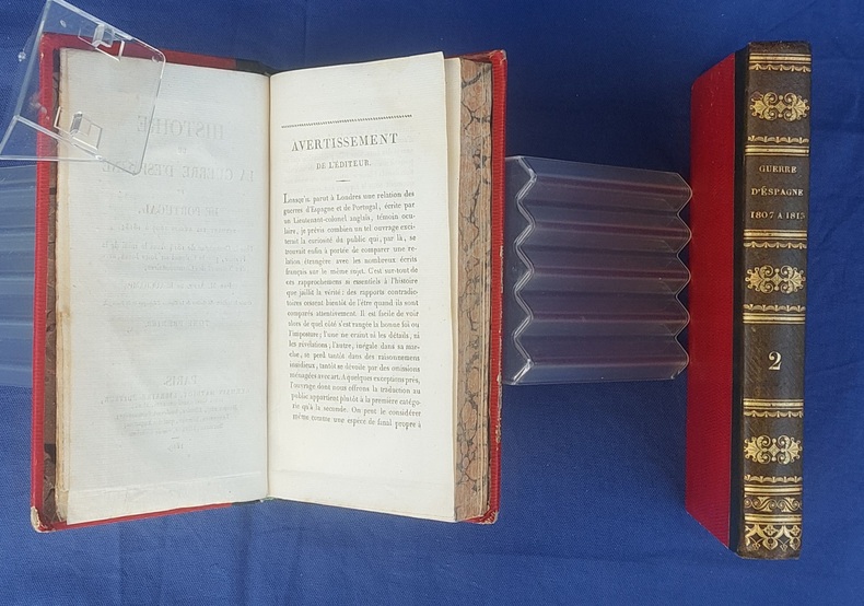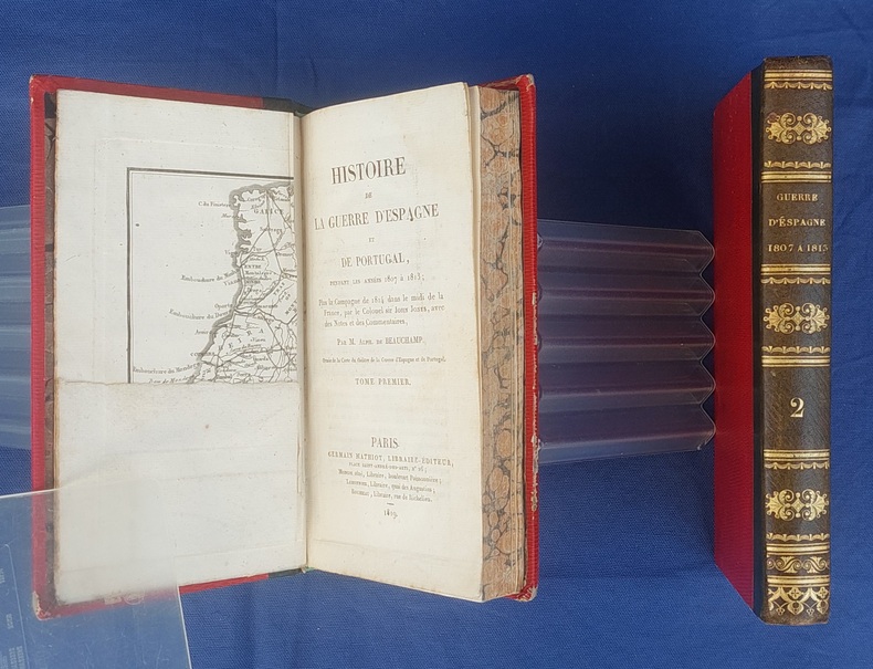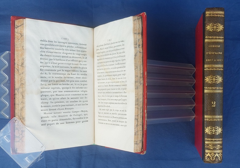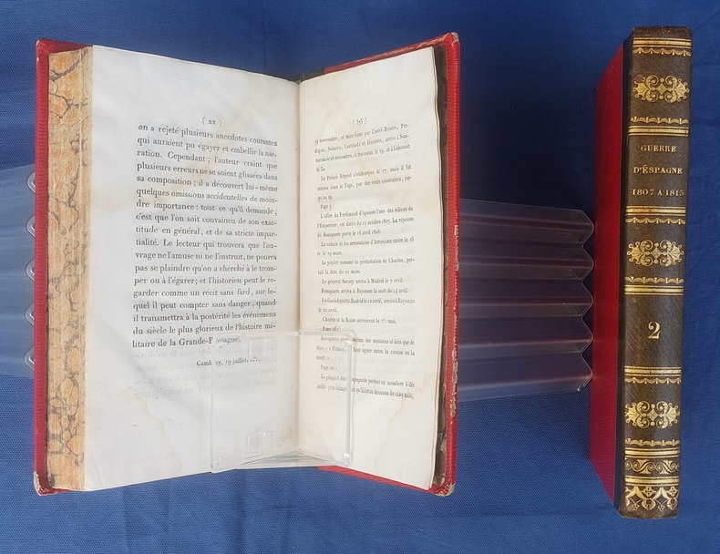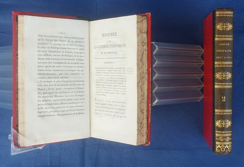 Paris, Germain Mathiot, 1819, 2 vol. in-8, demi-veau vert, dos lisse à faux nerfs richement orné, titre et tomaison dorés, papier rouge sur les plats, reliure de l’époque, tranches marbrées : 1 f. bl. suivi du faux-titre et du titre à chacun des volumes - 4 - xx - 380 - 386 pp. - Carte du théâtre de la Guerre d’Espagne et de Portugal, dépliante, placée en frontispice. Dos très légèrement passés, coins émoussés, larges mouillures claires aux deux tomes, 2 ff. de la préface (pp. xvij à xx) reliés entre les pp. 374-375. Édition originale, peu commune et non rééditée, de la traduction française annotée et commentée par M. Beauchamp, du témoignage anglais sur la Guerre d’Espagne par le major-général Sir John Thomas Jones, officier britannique du génie royal qui joua un rôle de premier plan dans plusieurs campagnes européennes du début du XIXe siècle.
