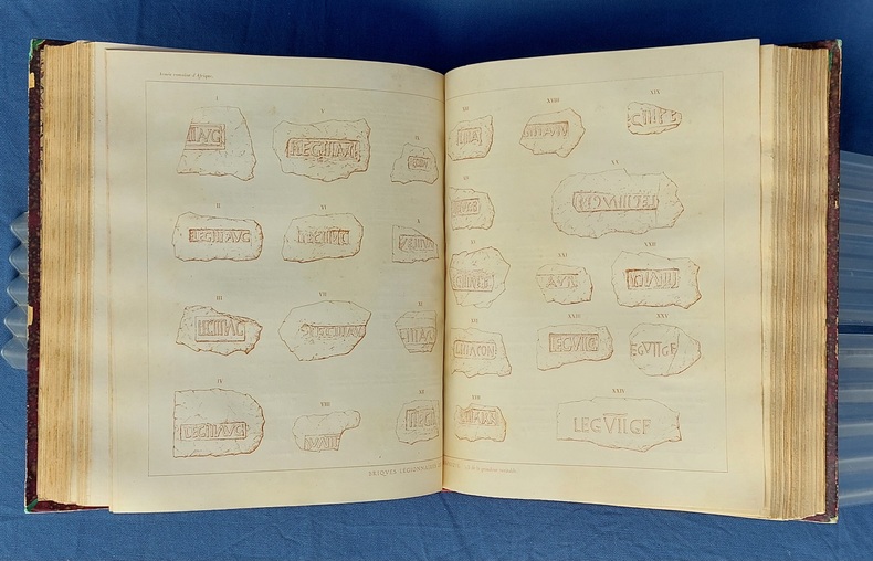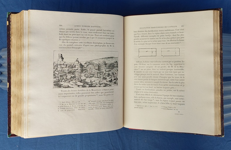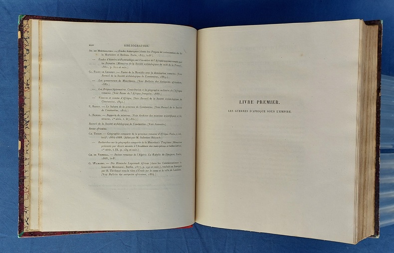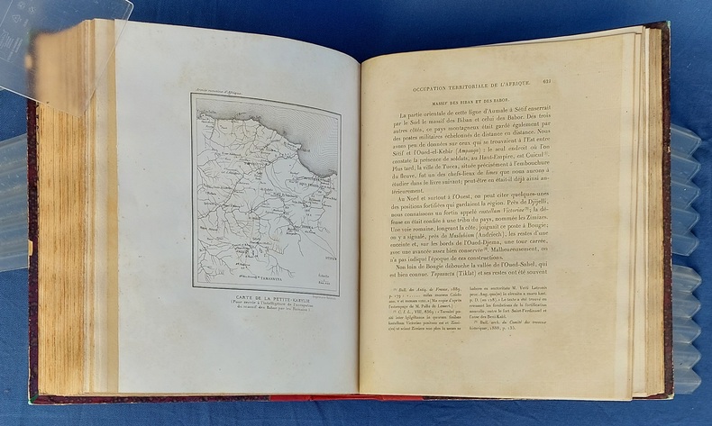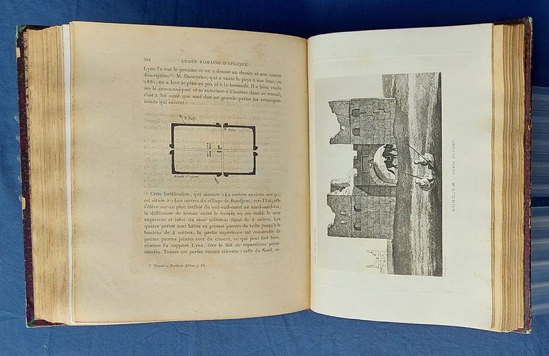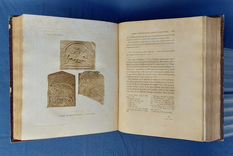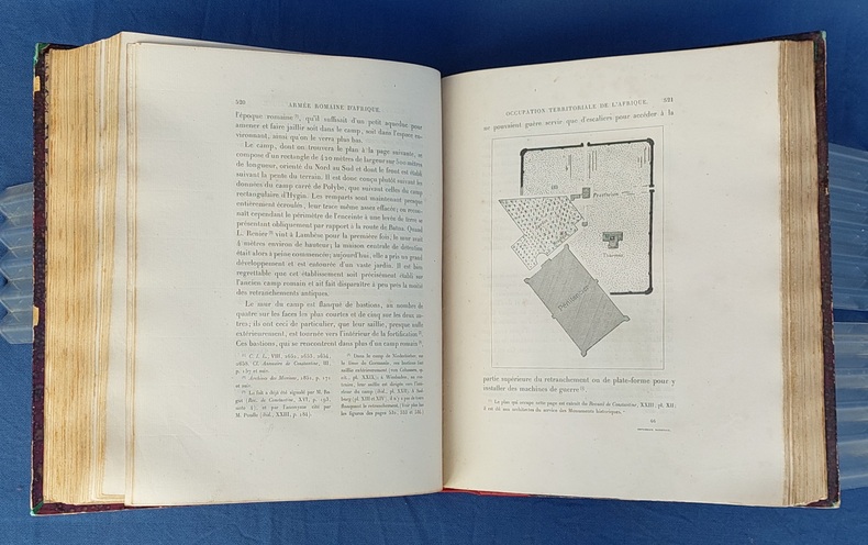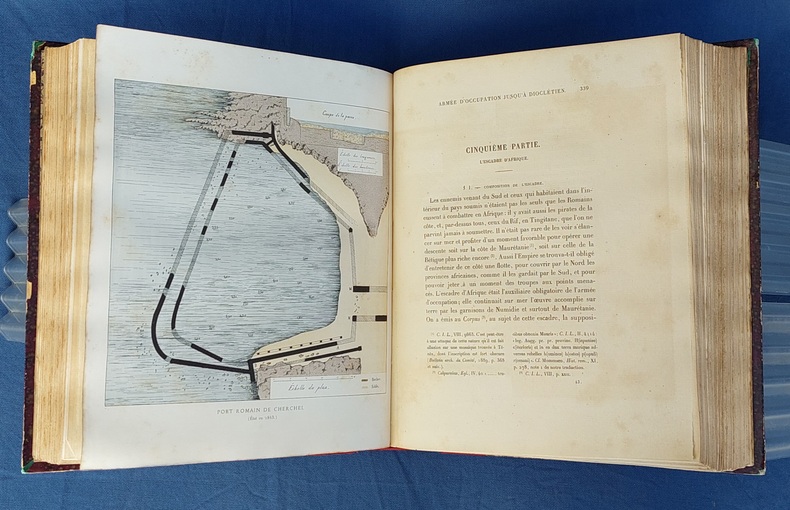 Paris, Imprimerie Nationale - E. Leroux, 1892, fort in-4, demi-veau rouge, dos lisse à faux-nerfs filetés dorés, titre doré, couvertures conservées, 1 f.n.c. - XXIV dont faux-titre et titre - [812] pp. dont Tables - croquis in-t. - 22 planches h-t. dont héliogravures, cartes et plans dépliants en couleurs dont une grande carte dépliante in-fine “carte de l’occupation militaire de l’Afrique par les romains”, texte imprimé sur un beau papier vergé. Frottements à la reliure, petites rousseurs éparses à partir des planches.