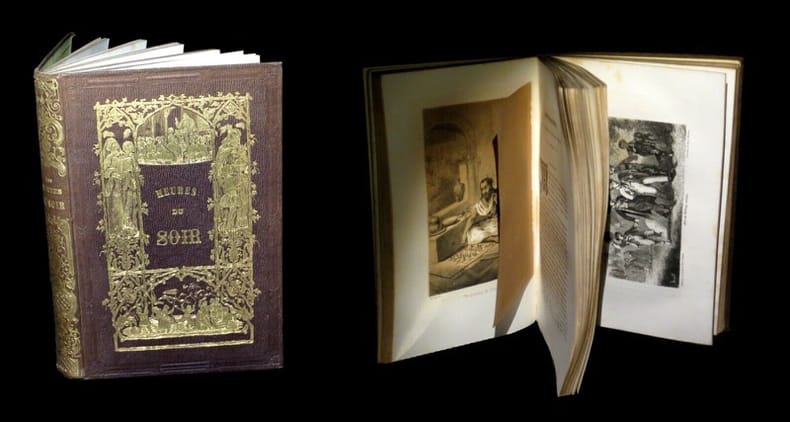 Exemplaire revêtu d'un élégant cartonnage romantique du temps ; signé au premier plat d'Haarhaus. ''Le nom d'Haarhaus apparaît sur des plats employés en vue d'ornementer un certain nombre de livres en percaline (ainsi que parfois en maroquin) [...]''. (in Ramsden). L'ouvrage, outre de nombreuses compositions dans le texte, s'agrémente de 4 planches lithographiées signées Bertrand ainsi que de nombreuses illustrations hors-texte. Ramsden, French bookbinders, p. 100. Angles et coiffes légèrement élimés. Rousseurs particulièrement prononcées aux premiers et derniers feuillets. Du reste, bonne condition. Rare.