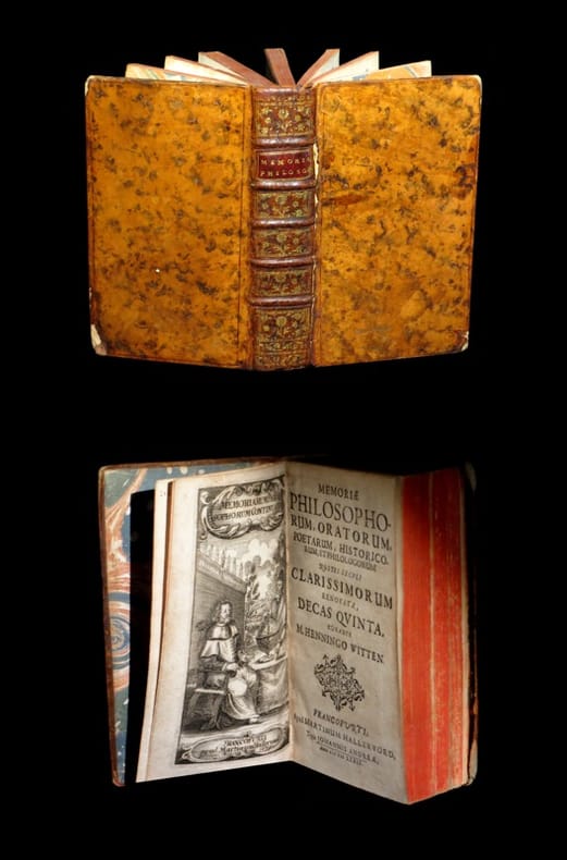 Francofurti [Frankfurt], apud Martinum Hallervord / typis Johannis Andreae, 1677 et 1679. 2 parties reliées en un fort vol. au format in-12 (173 x 103 mm) de 1 f. bl., 1 frontispice gravé n.fol., 628 pp. et 1 f. bl. Reliure de l'époque de plein veau marbré blond, filets à froid encadrant les plats, dos à nerfs orné de filets gras à froid, doubles caissons d'encadrement dorés, large décor fleuronné doré, semis de pointillés dorés, pièce de titre de maroquin acajou, titre doré, large palette dorée en queue, filet doré sur les coupes, tranches rouges.