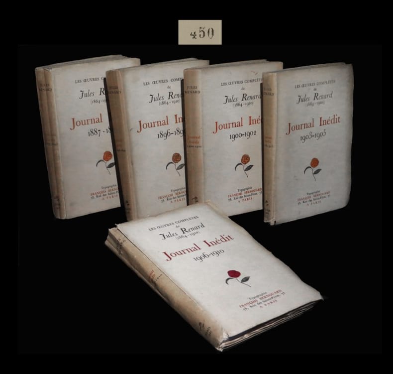 Édition originale. Le journal de Jules Renard, commencé en 1887 sous l'influence manifeste des Goncourt, se poursuivit jusqu'à sa mort. « Ce Journal fourmille d'images ingénieuses, de traits hardis et charmants, et l'on n'y est pas gêné par ces commérages suspects dont le Journal des Goncourt est plein. Au cours de sa longue et laborieuse vie, Goncourt n'a oublié d'observer que lui-même, mais quel oubli capital ! Jules Renard, au contraire, se scrute continuellement, et sans la moindre indulgence, et il se raille sur ses travers d'homme de lettre avec une franchise presque pénible » (André Billy). Ces 5 volumes font suite aux Oeuvres complètes publiées par Bernouard. Dix reproductions de portraits hors texte et un fac-similé d’écriture ; index des noms cités. Un des 50 exemplaires sur Hollande, second papier après 10 Japon. Dos à peine éclaircis, quelques traces sombres sinon très bon exemplaire en grand papier.