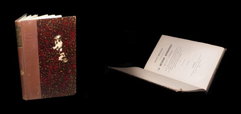 Edition originale rare. Exemplaire complet de ses 13 planches et tableaux in fine (dont un dépliant). ''La Méthode aspiratrice repose en grande partie sur l'emploi d'instruments assez fins pour qu'il soit permis de ne tenir aucun compte du traumatisme qu'ils déterminent. Ces instruments sont des aiguilles creuses capillaires ou à peu près, qui ne serviraient absolument à rien sans les appareils aspirateurs auxquels elles sont adapttées. Grâce à cette disposition, le médecin peut aller sans crainte à la recherche des collections liquides sur la nature ou l'existence desquelles in conserve des doutes. De plus, il peut en opérer l'écoulement à l'abri de l'air. Aussi, on peut utiliser l'aspiration comme moyen de diagnostic ou comme moyen de traitement.'' Angles et coupes élimés. Abrasions affectant le premier plat. Rares et claires rousseurs dans le texte. Du reste, belle condition. Rare.