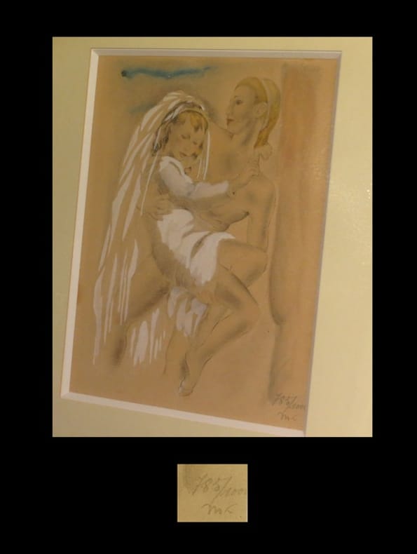 Délicieuse épreuve lithographiée avec rehauts à la main de gouache blanche ; numérotée et monogrammée à la main par Mariette Lydis en marge inférieure droite. ''Native de Vienne, Mariette Lydis vint se fixer à Paris en 1927, où elle y fut tout de suite remarquée. Dès le premier jour, il y eut un lien direct entre son art et la littérature. Elle dut sa notoriété principalement à ses estampes en couleurs et à ses illustrations. Graveur à la pointe délicate, curieusement proche de celle du japonais Foujita, avec, en outre, un rien de morbidesse, elle a réussi de délicats accords de ton, ou plutôt, de nuances. Elle a illustré de nombreux ouvrages.''. (in Bénézit). ''Depuis Memling jusqu'à Lautrec, en passant par Manet, bin des peintres ont inspiré cette jeune artiste, mais ce qu'elle a en propre, c'est une perversité qui ne doit rien à Rops.'' (In Osterwalder). Osterwalder III, Dictionnaire des illustrateurs, p. 1.064 - Bénézit VII, Dictionnaire des peintres, p. 31. Présentée sous cadre de belle facture. Petite tâche en marge inférieure gauche de la composition. Du reste, très belle condition.