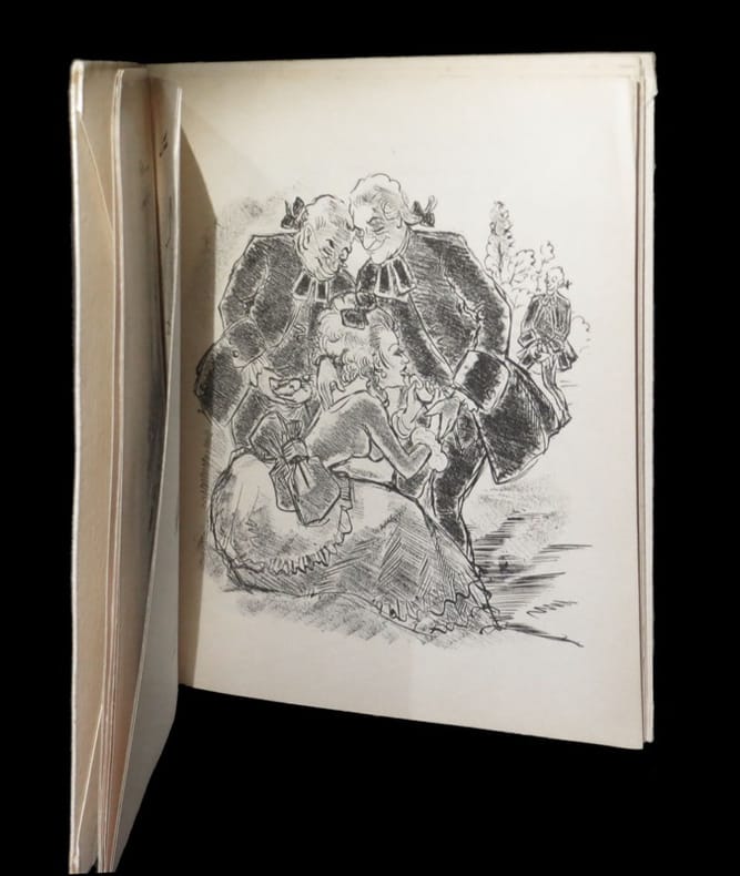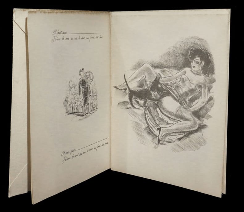 Sans mention d’éditeur, ni de date ( vers 1950 ). In-4 en feuilles sous chemise muette, avec couvertures rempliées, au format 23 x 29 cm. Plats et intérieur frais. Recueil de soixante lithographies en noir, qui proposent autant de savoureuses contrepèteries érotiques. 29 d’entre elles sont situées en pages de gauches, non érotiques, proposent le bon mot suivi de sa contrepèterie et font face aux 29 autres, situées, en pages de droites, qui comportent une magnifique illustration érotique en noir. Tirage unique à 500 exemplaires sur vélin d'Arches numérotés au composteur ( n° 569 ). Véritable chef-d’œuvre de la contrepèterie illustrée, jubilatoire en tous points, attribué à Raoul Serres. L’édition originale serait parue dans les années trente. Cette seconde édition fut publiée, quelques années plus tard, vers 1950, d’après Jean-Pierre Dutel. Superbe état général. Rare.