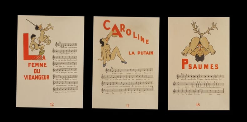 Au Quartier latin, non daté (circa 1939). Edition des "Chansons de Salles de garde" dans leur texte exact, réservé à un groupe d'amateurs (curiosa). Tirage très limité, non mis dans le commerce, celui-ci le n° 954. In-8 en feuilles sous double emboîtage (25 x 19,8 cm), 224 pages.- Premier tirage des nombreuses compositions en couleurs in et hors-texte de Joseph Hémard. 53 chansons de carabins illustrées par Joseph Hémard, en noir et rouge in-texte, en couleurs sur les 12 planches hors-texte, chaque chanson est proposée avec sa partition Un des exemplaires numérotés d'un tirage entièrement hors-commerce. Le colophon indique : ''Tirage réservé à un groupe d'amateurs, très limité et non mis dans le commerce''.-1,4kg.- Intérieur frais, chemise titrée et étui en parfait état.