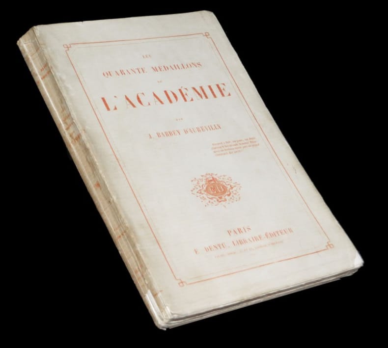 Edition originale. L'ouvrage contient autant de portraits d'Académiciens que de charges... Grelé, Barbey / Essai de bibliographie générale, p. 39 - Seguin, Barbey / Etude de bibliographie critique, p. 54 - Vicaire I, Manuel de l'amateur de livres du XIXème, 303 - Quérard I, Supercheries littéraires, 458 - Clouzot, Guide du bibliophile français, p. 25 - Carteret I, Le Trésor du bibliophile romantique et moderne, p. 109. Dos fendu. Infime manque angulaire sur chacun des plats ainsi qu'en marge du premier plat et en queue du dos ; lequel présente des tâches. Quelques rousseurs éparses dans le corps d'ouvrage. Idéalement, à relier.