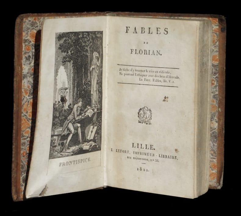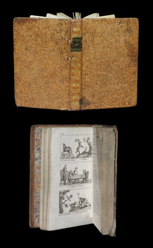L'ouvrage s'ouvre sur un frontispice gravé et renferme par ailleurs 13 jolies planches. Jean-Pierre Claris de Florian est particulièrement connu en tant que fabuliste, ses fables étant unanimement considérées comme les meilleures après celles de Jean de la Fontaine, construites avec élégance et solidité à la fois. Les morales de certains de ses apologues sont encore citées couramment, comme «Pour vivre heureux, vivons cachés» (Le Grillon), «Chacun son métier, les vaches seront bien gardées» (Le Vacher et le Garde-chasse) ou «L'asile le plus sûr est le sein d'une mère» (La Mère, l'Enfant et les Sarigues). Quant aux expressions «éclairer sa lanterne» ou «rira bien qui rira le dernier», elles sont tirées respectivement des fables Le Singe qui montre la lanterne magique et Les deux Paysans et le Nuage. Un angle émoussé. Petites altérations superficielles éparses affectant la reliure. Contre-gardes absentes. Cerne claire en marge supérieure des derniers feuillets. Quelques rousseurs ou tâches dans le corps d'ouvrage. Du reste, belle condition.