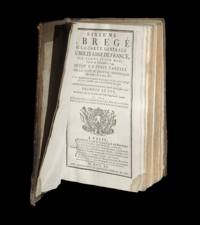 Edition originale. Ouvrage complet de ses trois parties ici reliées en un volume. ''Le présent livre contient un détail exact de tout ce qui regarde aujourd'hui le militaire de France sur terre et sur mer, et l'auteur n'a d'autre vue que de donner la connaissance nécessaire et la plus parfaite qu'il est possible des événements militaires de chaque année ; c'est-à-dire, des origines, créations, institutions, promotions, nominations, rangs, dignités, changements, uniformes, etc. dans les corps de troupes en général et des officiers généraux et principaux qui les ont commandés ou les commandent ainsi que des officiers généraux et supérieurs commandant dans les provinces et dans les places de guerre du royaume et de l'Amérique française''. Brunet III, Manuel du libraire et de l'amateur de livres, 971 - Quérard V, La France littéraire, p. 135. Desquamations et marques brunes affectant les plats. Quelques frottements au dos. Angles élimés. Petite tâche angulaire sur les feuillets liminaires. Quelques discrètes rousseurs dans le corps d'ouvrage. Du reste, bonne condition.
