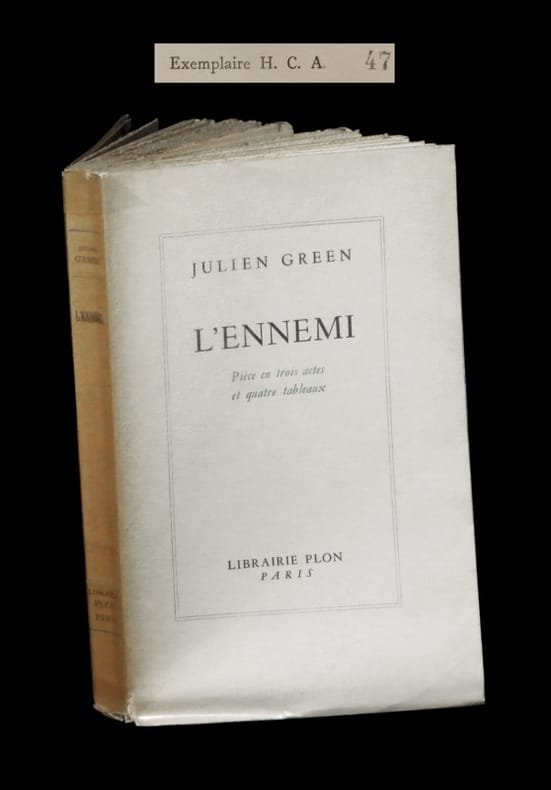 Edition originale. Un des 350 exemplaires du tirage numéroté sur Alfa-Mousse ; celui-ci comptant parmi les 50 Hors-Commerce (HC). L'ouvrage a conservé de larges témoins. ''Avant tout, il faut placer la seconde pièce de M. Julien Green - comme Sud, fa première - sur les hauteurs où lui-même veut respirer. Parmi les pièces ambitieuses, au creux desquelles Dieu et le Viable poursuivent leur duel ancien. Ici, la grâce se précipite ou se retire, les consciences entrent en effervescence ; on prononce les mois terribles de salut éternel, de foi, de Créateur et de Créature.'' (Robert Kemp). Petit défaut affectant chacune des coiffes. Du reste, très belle condition. Exemplaire non coupé.