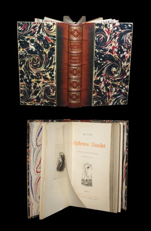 Exemplaire revêtu d'une délicate reliure du temps. Il s'ouvre sur un frontispice gravé figurant l'auteur ; signé Martinez dans la plaque. Jeune encore et déjà lassé du sombre et bruyant Paris, Alphonse Daudet vient de passer les étés dans son moulin de Fontvielle, " piqué comme un papillon " sur la colline parmi les lapins. Dans cette ruine ensoleillée de la vallée du Rhône, naissent ces contes immortels qui assureront sa gloire. Au loin, on entend la trompe de Monsieur Seguin sonnant sa jolie chèvre blanche. Dans le petit bois de chênes verts, un sous-préfet s'endort en faisant des vers. Au ciel, où les étoiles se marient entre elles, le Curé de Cucugnan compte ses malheureux paroissiens. Et dans la ville voisine, un jeune paysan meurt d'amour pour une petite Arlésienne tout en velours et dentelles qu'on ne verra jamais. Le vieux moulin abandonné est devenu l'âme et l'esprit de la Provence. Dans le silence des Alpilles ou le trapage des cigales et des tambourins, parfumés d'émotions , de sourires et de larmes, ces contes semblent frappés d'une éternelle jeunesse. Dos et marge des plats insolés. Du reste, très belle condition.