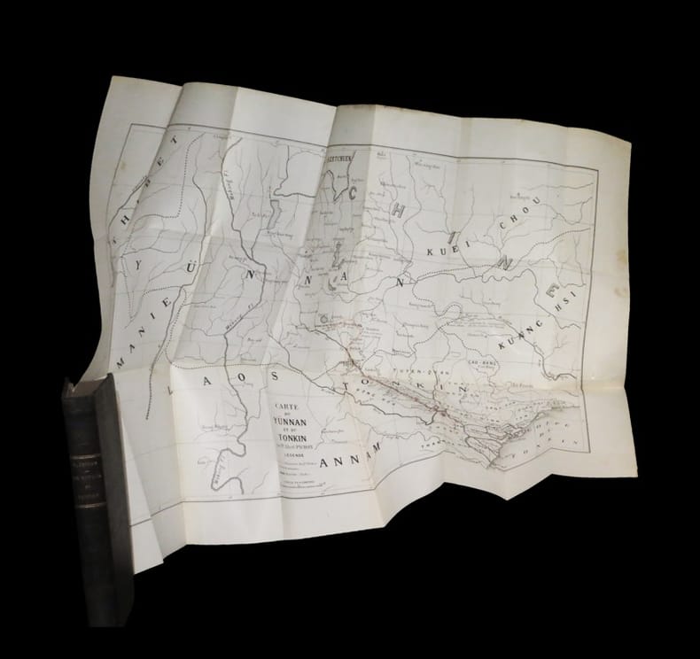 Paris, Librairie Plon, Editions Plon et Nourrit, 1893. 1 volume in-12, VII-286 pp., 1 grande carte dépliante (54x34 cm) du Yunnan et du Tonkin, reliure moderne plein cuir bleu, couvertures conservées, très bon état.