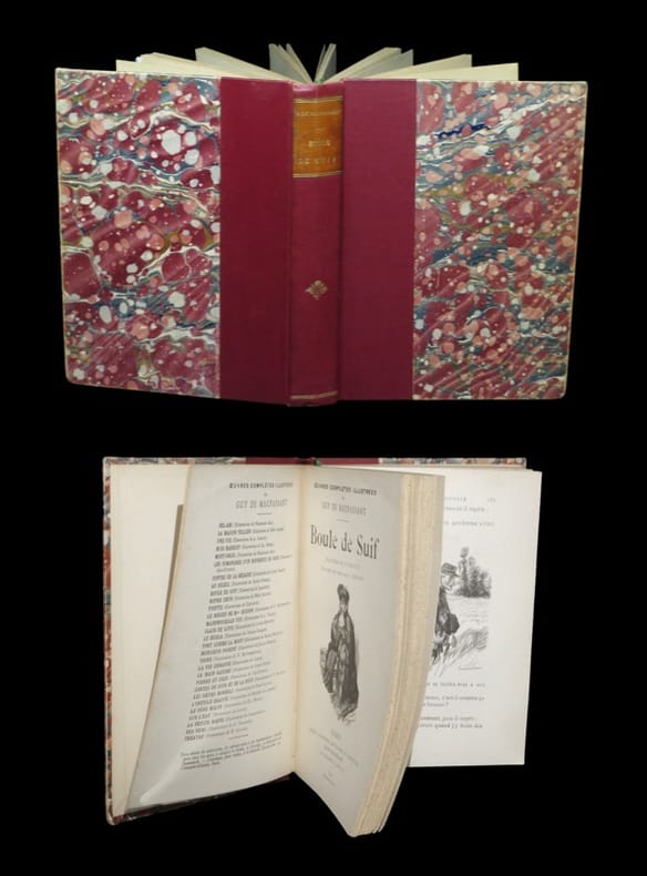 Exemplaire revêtu d'une ragréable eliure du temps. L'ouvrage s'agrémente - ici en premier tirage - de jolies compositions de Georges Jeanniot. ''Rouen, occupé par les Prussiens, durant la guerre de 1870. Des bourgeois tentent de fuir la ville en diligence. Parmi eux se trouve une prostituée, celle qu'on surnomme Boule de suif. Tous vont abuser de sa générosité et la forcer à céder au chantage sexuel d'un Prussien. Maupassant dresse ici un portrait inégalé de l'hypocrisie et de la lâcheté humaines. Il condamne sans appel la guerre et la classe dirigeante, paternaliste et profiteuse. Il nous communique toute sa tendresse pour une fille au grand coeur, symbole d'une résistance vouée à l'échec.''''Les contemporains de Jeanniot, Manet, Pissarro et Degas en particulier, l'estimaient beaucoup. Il se pourrait à cet égard que Degas et Jeanniot se soient mutuellement aidés dans la pratique du monotype''. (in Bailly-Herzberg). ''Jeanniot fut un illustrateur précis et spirituel, à la verve peu commune''. (Kahn, cité in Osterwalder).Bailly-Herzberg, Dictionnaire de l'estampe en France, p. 161 - Osterwalder I, Dictionnaire des illustrateurs, p. 534 (citant la présente contribution de l'artiste) - Talvart & Place XIII, Bibliographie des auteurs modernes, 259 - Carteret III, Le Trésor du bibliophile / Livres illustrés modernes, p. 272 - Carteret IV, Le Trésor du bibliophile / Illustrés modernes, p. 124. Angles et coupes élimés. Très rares autant que discrètes rousseurs dans le corps d'ouvrage. Du reste, très belle condition.