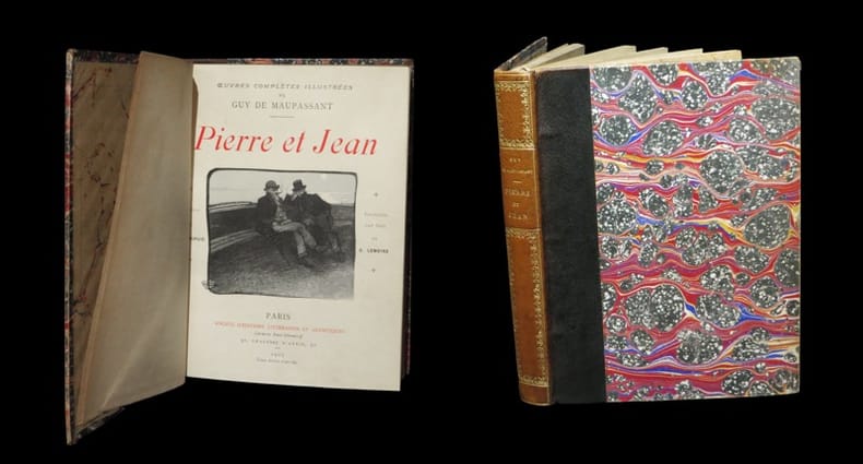 Exemplaire revêtu d'une reliure décorative du temps. L'ouvrage s'agrémente - ici en premier tirage - de jolies compositions de Géo Dupuis. ''Natif du Havre, il commença à travailler chez l'éditeur Ollendorff et se consacra, jusqu'en 1905, à l'illustration de livres''. (in Osterwalder). L'ouvrage s'ouvre sur la célèbre préface de Maupassant - qui ne figurera pas dans l'édition de 1894 - intitulée Le Roman, au sein de laquelle l'auteur expose en sa vision du roman naturaliste et critique le genre de l’étude psychologique. ''Tout les oppose. Alors que Jean est blond, calme, doux, de caractère égal, Pierre est noir, emporté, rancunier, exalté. Tant que rien n'ébranle l'équilibre familial, les deux frères mènent une vie apparemment paisible. Mais lorsqu'un ami de la famille lègue toute sa fortune à Jean, la jalousie que Pierre nourrit pour son frère cadet éclate au grand jour. Il enquête alors pour découvrir les raisons de cet incompréhensible héritage, au risque de sacrifier son bonheur... Célèbre tant pour le récit que pour sa préface conçue comme une réflexion sur le roman, cette oeuvre naturaliste constitue une pièce maîtresse de l'oeuvre de Maupassant.'' Talvart & Place XIII, Bibliographie des auteurs modernes, 259 - Carteret III, Le Trésor du bibliophile / Livres illustrés modernes, p. 270 - Carteret IV, Le Trésor du bibliophile / Illustrés modernes, p. 124 - Osterwalder II, Dictionnaire des illustrateurs, p. 337. Angles et coupes légèrement élimés. Dos insolé. Rousseurs dans le corps d'ouvrage ; dont quelques feuillets sont davantage pourvus. Du reste, belle condition.