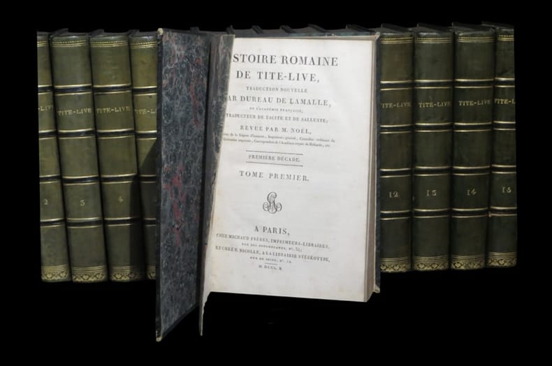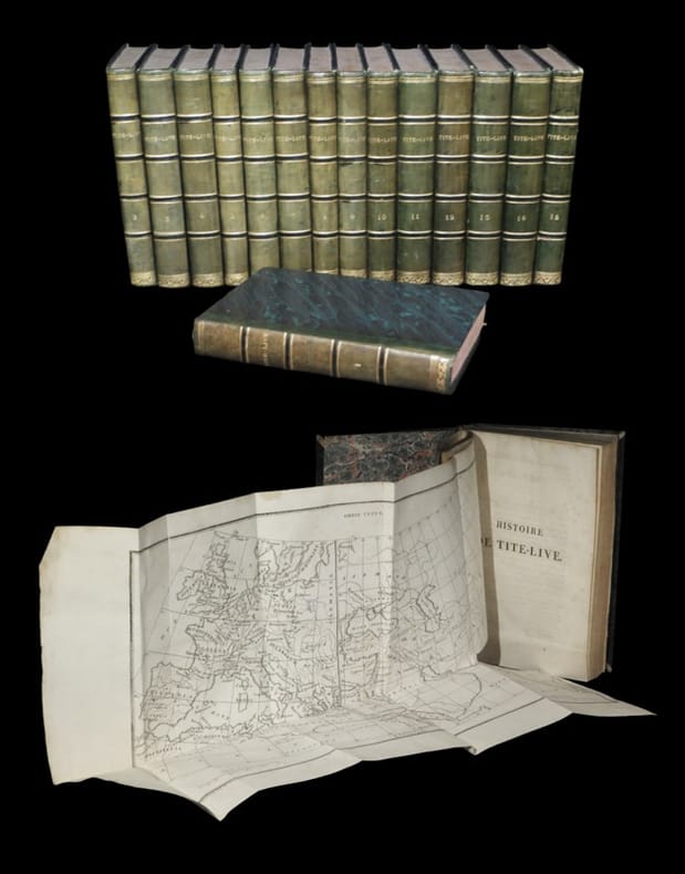 Ensemble complet de ses 15 volumes. Le premier renferme une grande carte dépliante gravée. Texte en latin avec traduction française en regard. L'ouvrage de Tite-Live narre l'histoire des premiers siècles de Rome depuis sa fondation jusqu’en 292 av. J.-C., le récit de la deuxième guerre punique et de la conquête par les armes romaines de la Gaule cisalpine, de la Grèce, de la Macédoine, et d’une partie de l’Asie Mineure. Le dernier évènement important qui s’y trouve relaté est le triomphe de Paul Émile à Pydna en 168 av. J.-C. Il s’agit ici pour l'auteur non seulement d’élever «un monument à la gloire de Rome» mais surtout de rappeler l’ancienneté et la continuité sans faille de l’histoire de la ville. L’Histoire selon Tite-Live n’est pas objective: elle idéalise les grands hommes et reste pleine de prévention à l’égard des démocrates. Dans cette Histoire de Rome se trouve également la première uchronie connue: Tite-Live imaginant le monde si Alexandre le Grand était parti conquérir l’ouest et non l’est de la Grèce. En outre, l'introduction livre le propos de Tite-Live: commémorer les hauts faits de Rome, la cité alors maîtresse du monde méditerranéen, décrire les hommes et les modes de vie à l'origine de la grandeur de la ville et la décadence morale à l'époque des guerres civiles, de façon que les lecteurs puissent tirer les enseignements de l'Histoire. En somme, ouvrage didactique tout autant que de morale. Pour une édition de 1830 : Graesse IV, Trésor de livres rares et précieux, p. 284 - Brunet III, Manuel du libraire et de l'amateur de livres, 1112 - Vicaire I, Manuel de l'amateur de livres du XIXème, 694 - Quérard IX, La France littéraire, p. 493 - Bourquelot VI, La Littérature française contemporaine, p. 481. Légères altérations superficielles affectant les reliures. Dos légèrement passés. Quelques rousseurs et tâches claires dans les corps d'ouvrages. Cerne en marge de quelques feuillets d'un des volumes ; traversante dans un autre. Quelques cahiers parfois oxydés. Du reste, bonne condition.