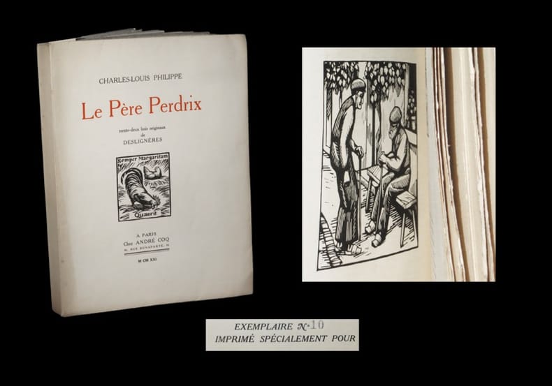 Edition originale ; ''recherchée''. (in Carteret). Tirage de tête : un des 10 premiers exemplaires du tirage numéroté sur vieux Japon (ici dénué du dessin original et des deux suites annoncés au colophon). L'exemplaire a ici conservé de larges témoins. L'ouvrage s'agrémente - en premier tirage - de jolies compositions gravées sur bois par André Deslignères. ''Elève de l'Ecole Germain Pilon à Paris, ce graveur renommé et artiste sensible et savant a illustré un grand nombre d'ouvrages''. (in Bénézit). ''Deslignères est un graveur d'une grande habileté. Son métier n'a plus pour lui de secrets et il creuse le bois avec une véritable maîtrise''. (Jean Dorsenne, cité in Osterwalder). ''Les menus faits [ici dépeints] tissés dans la trame des jours se rattachent aux éternels problèmes : la fatalité, les rapports de famille, les rapports sociaux dominent jusqu'à la plus humble vie.'' Mahé, Répertoire des éditions de luxe, p. 68 - Carteret V, Le Trésor du bibliophile / Illustrés modernes, p. 157 - Monod II, Manuel de l'amateur des livres illustrés modernes, 8067 - Bénézit III, Dictionnaire des peintres, p. 524 - Osterwalder II, Dictionnaire des illustrateurs, p. 304. Dos légèrement passé. Quelques discrètes rousseurs sur les témoins ainsi qu'au second plat. Du reste, très belle condition.