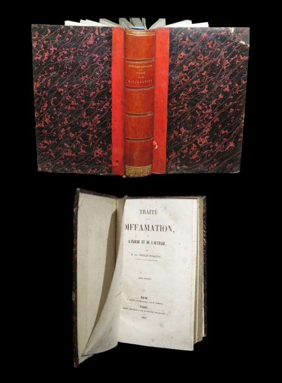 Edition originale. Ensemble complet de ses deux tomes ; ici reliés en un fort volume. Belle impression sur vergé d'édition. ''Les caractères constitutif de la diffamation ont attiré toute l'attention de l'auteur du présent traité, et il ne croit pas avoir laissé beaucoup à dire sur l'allégation ou l'amputation, le fait déterminé et précis, l'atteinte à l'honneur ou à la considérations, les lieux ou réunions publiques, l'intention de nuire. Les éléments de l'injure et de l'outrage ont été aussi de sa part l'objet d'une analyse de détail faite avec le plus grand soin. Mais, plus encore, son étude de la preuve du fait diffamatoire''. Un angle accidenté. Infime manque superficiel en marge gauche du premier plat. Cerne angulaire claire aux feuillets liminaires. Rousseurs éparses dans le corps d'ouvrage. Du reste, bonne condition. Peu courant.