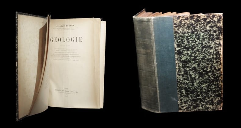 Edition originale. ''Cet ouvrage constitue un exposé purement didactique des notions actuellement acquises''. Esprit ingénieux et cultivé, Stanislas Meunier s'était surtout préoccupé des grandes questions géologiques : la théorie de la terre, l'activisme,la géologie comparée et expérimentale. On lui doit de très importantes études, notamment sur les météorites. Il a poursuivi les recherches sur la géologie expérimentale menées par Auguste Daubrée dont il fut l'aide-naturaliste. En 1866, alors jeune chimiste éléve d'Edmond Frémy, Il entre au Muséum national d'histoire naturelle. Il y devient professeur de (1892-1920), il a le premier enseigné "la géologie expérimentale comme une branche distincte de la science" et entre autres a réalisé le premier travail d'ensemble sur le Bassin parisien (géothermie, tremblements de terre...). Angles et coupes élimés. Décoloration affectant le dos. Le premier cahier a subi de peu habiles tentatives de restauration aux fonds de cahiers. Papier légèrement oxydé. Du reste, bonne condition.
