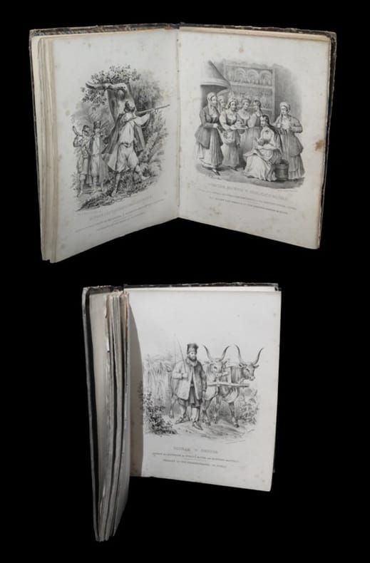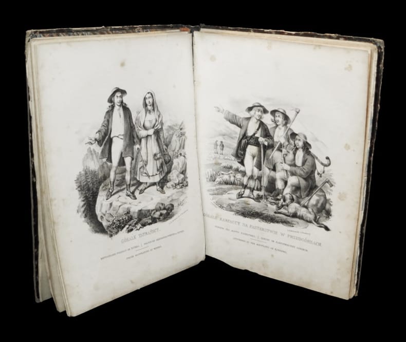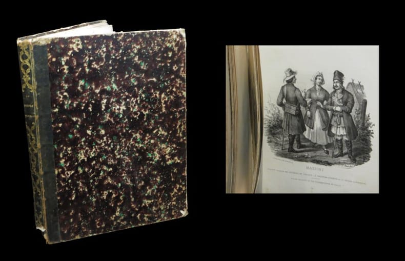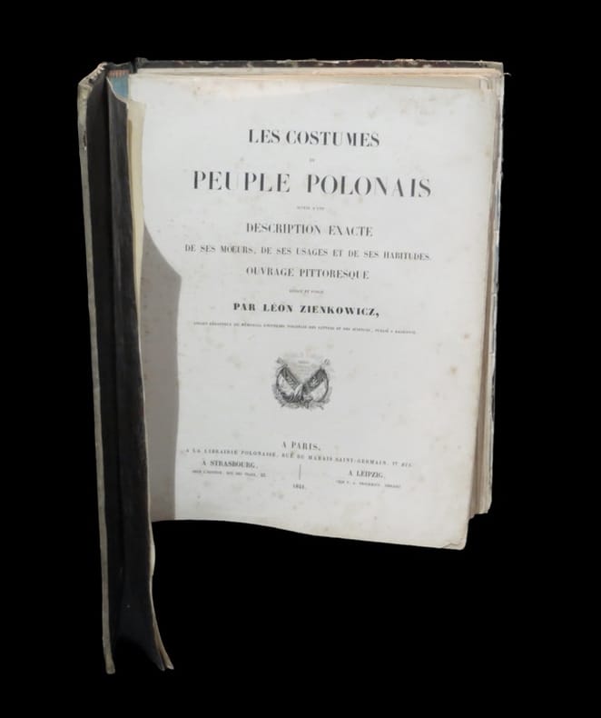 Edition originale. Ouvrage dédié aux Amis de la cause polonaise. La Pologne, alors sous domination russe, s'étant vue interdire le port des costumes ici figurés. Recueil recomposé comportant 37 jolies planches lithographiées ; chacune légendée en polonais, français et allemand. Elles sont signées dans la plaque Jan Lewicki et A. Wittmann. ''L'ouvrage a été publié en 10 livraisons de 4 lithographies chacune et de une feuille et demie de texte''. (in Colas). ''Né en 1802 à Osiek en Pologne, mort à Paris en 1871. Lewicki tudia à Cracovie, Strasbourg, Nancy et Paris. Il peignit à l'huile, à la gouache, dessina et lithographia des portraits, des vues et des compositions religieuses''. (in Bénézit). Le présent recueil ne renferme ici que 29 feuillets de texte rendant compte de la Musique, des danses et des chants en Pologne (avec partitions) ainsi que des Croyances, superstitions et préjugés populaires. Bénézit VI, Dictionnaire des peintres, p. 635 - Colas, Bibliographie du costume, 315 (126 pp. de texte et 40 planches) - Louandre & Bourquelot VI, La Littérature française contemporaine, p. 617 - Quérard X, La France littéraire, p. 565. Angles émoussés. Manque en queue du dos. Mors frottés et fendillés. Ouvrage entièrement dérelié. Inégales rousseurs dans le corps d'ouvrage. Déchirure en marge d'une planche. Un feuillet de texte très légèrement effrangé.