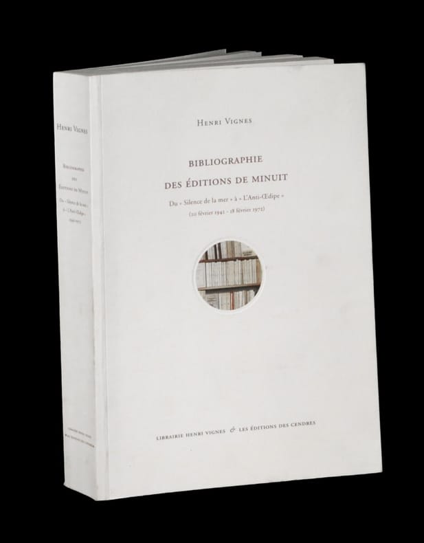 ''Sont ici présentés 639 livres qui jalonnent, de 1942 à 1972, les années les plus fécondes de l'éditeur. La présente bibliographie constitue un outil de travail précieux pour les chercheurs et les amateurs de livres, qui leur permet d'entrer, à travers des notices détaillées et différentes annexes, dans l'univers des Editions de Minuit, présenté sous la première fois sous cette forme exhaustive''. Plats présentant un éclat légèrement altéré. Du reste, très belle condition.