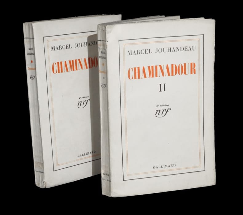 Edition originale avec mention fictive d'édition pour chacun de ces deux volumes. «Chaminadour, c'est la vie spectrale et irradiée, il y a cent ans, d'une grise petite ville peuplée d'artisans, de fonctionnaires et de ruraux. Chaminadour est un "arbre de visages". Un bouquet d'âmes pures, un roncier d'âmes damnées, un foisonnement de faits et gestes cocasses ou tragiques, éclatants, infâmes, arrachés au secret. "J'ai besoin des passions, des mains jaunes, des cœurs rouges de Chaminadour", disait magnifiquement René Crevel. Nous en avons plus que jamais besoin, nous qui, en une époque morose, déprimée, désenchantée, demandons à la littérature non pas de nous divertir mais de nous délivrer des pesanteurs sociales, de nous rendre la mémoire des siècles, de nous donner la pleine mesure de l'homme sans le discours humaniste, affadi ou psychologisant, et de nous émerveiller dans le pire.» Dos présentant quelques discrètes altérations superficielles. Papier du premier volume légèrement oxydé. Du reste, bonne condition.