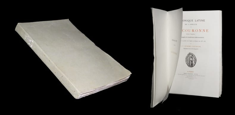 Edition originale. Tirage unique à 120 exemplaires seulement. Belle impression sur vélin fort agrémentée de quelques jolis ornements typographiques ainsi que de planches. ''Il était important de donner une reproduction fidèle de ce document paléographique, si utile pour faire connaître l'origine et les deux premiers siècles de l'une des plus célèbres abbayes de nos provinces de l'ouest''. Très belle condition. Exemplaire non coupé. Rare.