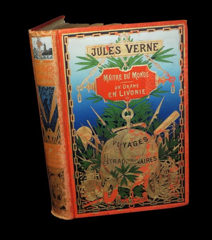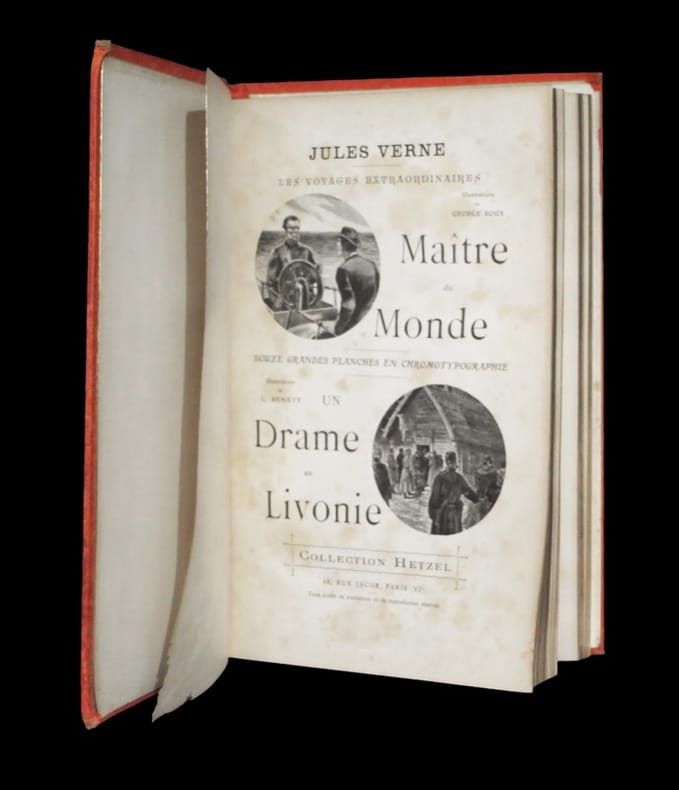 ''Première édition collective illustrée. Cartonnage ''au globe doré'' de type 4, dont c'est l'ultime apparition pour une nouveauté, mis en vente à la fin de 1904''. (in Jauzac). Jauzac, Hetzel et les cartonnages illustrés, n°322 (reproduit pleine page) - Bottin, Bibliographie des éditions illustrées des Voyages extraordinaires de Jules Verne en cartonnage éditeur de la collection Hetzel, p. 283. Angles élimés. Abrasions éparses affectant le premier plat ; quelques tâches blanches au second. Dos passé présentant en outre des décolorations éparses. Les 4 premiers feuillets souffrent d'une petite altération marginale causée par un rongeur peu afférent. Rousseurs dans le corps d'ouvrage ; davantage marquées aux premiers et derniers feuillets.