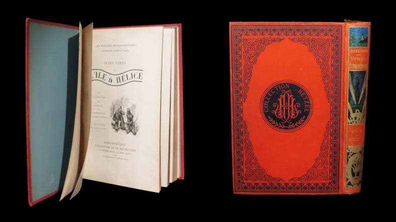 ''Première édition illustrée revêtue d'un cartonnage dit ''au portrait collé'' ; dont c'est l'ultime apparition pour une nouveauté''. (in Jauzac). Bottin, Bibliographie des éditions illustrées des Voyages extraordinaires de Jules Verne en cartonnage éditeur de la collection Hetzel, p. 217 - Jauzac, Hetzel et les cartonnages illustrés, p. 278. Infimes autant que très discrètes altérations superficielles affectant dos et plats. Du reste, très belle condition.