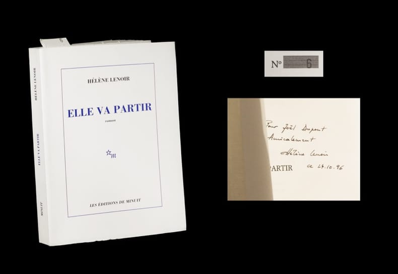 Edition originale. Tirage de tête : un des 13 exemplaires du tirage numéroté sur vergé de Vizille (seul papier) ; plus 7 hors-commerce. Exemplaire agrémenté au faux-titre d'un envoi autographe signé d'Hélène Lenoir. ''Si la vieille dame meurt, son fils Camelin vendra la maison ou la fera démolir, peu importe. Ce qui est sûr, c’est que les locataires (Mattis, au premier, madame Petersen et son enfant, au second) devront s’en aller. En attendant, les souris cavalent d’un étage à l’autre et le vent fouette dehors et la vieille dame est toute seule à l’hôpital après l’attaque qui l’a terrassée le matin même…'' Très belle condition. Exemplaire non coupé.