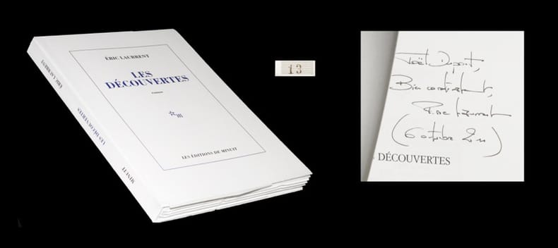 Edition originale. Tirage de tête : un des 25 exemplaires du tirage numéroté sur vergé de Vizille (seul papier) ; plus 7 hors-commerce. Exemplaire agrémenté au faux-titre d'un envoi autographe signé d'Eric Laurrent. 'De la vue d'une reproduction des Sabines de David dans un vieux dictionnaire jusqu'à sa première nuit d’amour, ce livre évoque la croissante fascination d’un jeune garçon pour le corps féminin. L’affiche du film érotique Emmanuelle, telle scène de baignade dans Tarzan et sa compagne, la double page centrale d’un numéro de la revue de charme Penthouse, un strip-tease dans une fête foraine en marqueront quelques étapes. Mais il sera aussi question des jeux troubles de la prime enfance et de certaines expériences propres à l’adolescence.'' Très belle condition.
