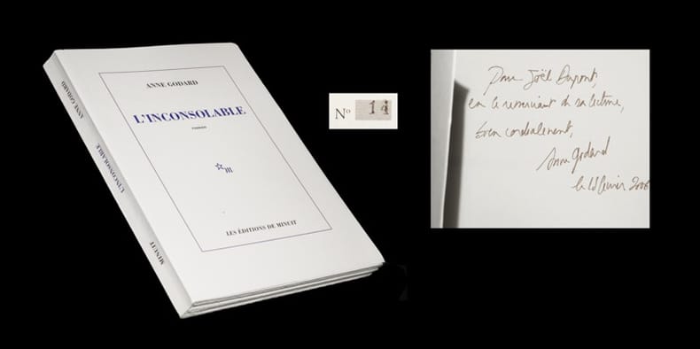 Edition originale. Tirage de tête : un des 25 exemplaires du tirage numéroté sur vergé de Vizille (seul papier) ; plus 7 hors-commerce. Exemplaire agrémenté au faux-titre d'un envoi autographe signé d'Anne Godard. ''Tu n'aurais jamais cru que tu survivrais, mais tu vis pourtant, tu continues, de date en date, et depuis si longtemps. Tu vis contre son absence, contre la vie qui l'a permise, contre les autres, parce qu'ils oublient, et contre toi, qui ne peux rien effacer. Malgré toi, tu restes en attente d'autre chose, mais quoi ?'' Très belle condition. Exemplaire non coupé.