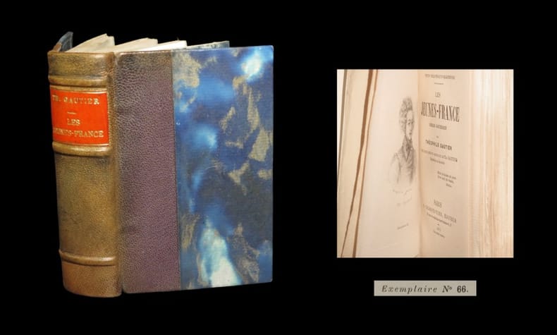 Les jeunes-France romans goguenards suivis de contes humoristiques. In 12 demi-toile violine à la bradel, pièce de titre cuir. Faux-titre, titre, XVIII ; 369 pages, 1 page de table, non rogné. Paris CHARPENTIER & Cie 1875. Quelques pâles rousseurs éparses. Sinon bon exemplaire.