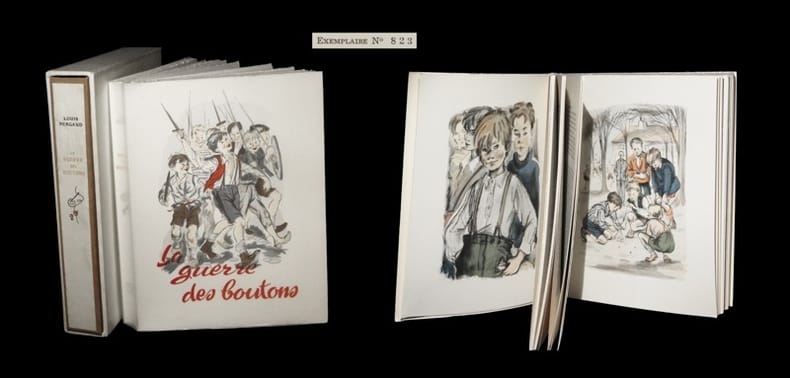 La Guerre des boutons est un roman français écrit par Louis Pergaud, écrivain franc-comtois, et publié en 1912. Il décrit la « guerre » que se livrent les bandes d'enfants de deux villages rivaux, Longeverne et Velrans, dans la campagne franc-comtoise de la fin du XIXe siècle. L'auteur s'est inspiré de la vie dans le village de Landresse, dans le département du Doubs, où il a enseigné deux ans. Le titre vient du butin de cette guerre, constitué en majorité par les boutons dont les vaincus sont dépouillés par les vainqueurs. Le récit, pour la plus grande partie, raconte l'histoire du point de vue des enfants de Longeverne. Louis Pergaud remporta le prix Goncourt avec De Goupil à Margot, Histoire de bêtes en 1910, mais c'est avec La Guerre des boutons qu'il rencontra le succès. Il fut tué près de Marchéville (dans les environs de Verdun) le 4 avril 1915. Insolation au dos et légères usures et salissures à l'étui.