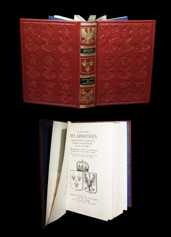 L'ouvrage s'agrémente de la reproduction de nombreux blasons. En 1579, Hiérosme de Bara séjourna à Lyon où il fit éditer à plusieurs reprises son œuvre héraldique. Publiée pendant la guerre civile et la crise monarchique, elle s’inscrit dans le courant critique envers la noblesse qui n’assume plus son idéal et laisse à l’abandon les vertus symboliques matérialisées par le blason. Bara, dans ses commentaires, se désolait de l’usage irresponsable des armoiries par les roturiers parvenus:«Et comme le temps a amené (en plusieurs choses) une forme d’ignorance, et aux hommes une volonté de faire selon leur désir, lesquels ayant trouvé aucuns obtempérants à leur vouloir, se sont ensemble donné licence, selon que l’on voit aujourd’hui, de faire ce que bon leur semble en armoiries... Ce que l’on voit en une infinité d’armoiries qui sont malfaites, et pirement armoyées de plusieurs sortes... [Quelqu’un, le] surnom étant Charpiot, portera d’azur, à un char à quatre roues de gueules, chargée d’une pie, ou agache, de sable, tenant en son bec un os d’argent...» Très belle condition.