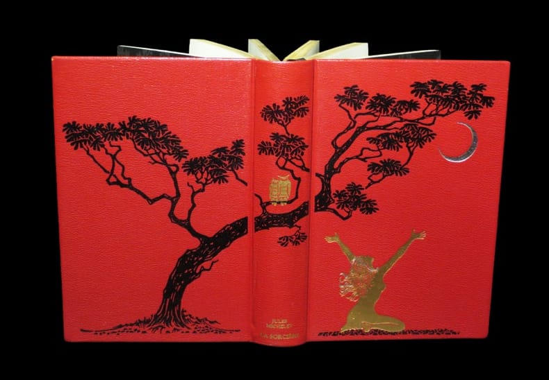 Belle impression sur vergé agrémentée de charmantes compositions à pleine-page de Martin Van Maele. Le but du présent ouvrage visait à la réhabilitation de ''la sorcière'', doublé de l'intention d'esquisser en ces pages un «hymne à la femme, à la fois bienfaisante et victime.» Car, à parution, la figure de la sorcière avait tout entière disparue derrière l’image du diable. En outre, le livre dénonce et accuse l’église d’avoir fomenté une chasse aux sorcières à travers les âges, cela, depuis les temps médiévaux jusqu'au XVIIIème siècle. Aussi, ceci suscita-t-il un scandale. Mais l’auteur - se défendant - invoqua là un simple travail d’historien et de romancier. En somme, il réfuta avoir été mû par quelque intention visant à mettre en accusation l'institution cléricale. Ce livre reste néanmoins une véritable démonstration de la fonction utile et salutaire de la sorcière face au savoir officiel détenu par l’Eglise, développé ici à partir d’un épisode historique. De plus Michelet utilise savamment le style poétique et, cet ouvrage paraissant d’une vraisemblance telle, qu'elle confère à l'ensemble un intérêt plus grand encore. Discrètes altérations superficielles affectant le premier plat. Du reste, très belle condition.