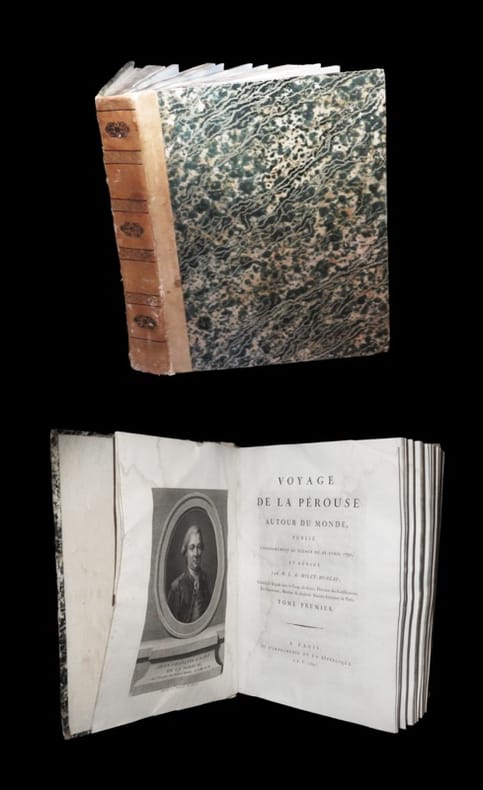 Edition originale. Tome Ier seul (sur 4). Il s'ouvre sur un joli portrait-frontispice gravé. Quelques cahiers imprimés sur papier légèrement bleuté. ''Ce voyage a été rédigé d'après les journaux que le célèbre navigateur avait envoyé du Kamtschatka et de Botany-Bay. Le gouvernement abandonna le produit de sa vente à la veuve La Pérouse. C'était Milet de Mureau lui-même, lorsqu'il siégeait à l'Assemblée constituante, qui avait fait décréter l'impression aux frais de la nation, des manuscrits du voyageur La Pérouse, et la continuation de ses appointements à son épouse, jusqu'au retour des vaisseaux envoyés à sa recherche''. (in Quérard). ''La mission de La Pérouse, indépendamment de son programme scientifique visait à compléter les observations de Cook et avait pour but d'observer la côte américaine entre la Haute-Californie et l'Alaska, ainsi que d'ouvrir de nouveaux débouchés en Chine, au Japon, et même peut-être dans la mer de Corail. La Pérouse se vit remettre - peu avant son départ - les instructions de Louis XVI, lequel achevait ainsi son propos : ''Sa Majesté regarderait comme un des succès les plus heureux de l'expédition qu'elle put être terminée sans qu'il eût coûté la vie à un seul homme''. (in Histoire universelle des explorations)." L'expédition se composait de deux gabarres : l'Astrobale et la Boussole, et comptait à son bord nombre des plus éminents scientifiques de l'époque. On appareilla à Brest le 1eraoût1785. Le cap Horn fut ensuite aisément franchi et l'on arriva à la baie de Concepción (Chili) le 23février1786. Le 9 avril, La Pérouse fit escale à l’île de Pâques, et, en mai, aux îles Sandwich (Hawaii) où il découvrit l’île Maui négligée par James Cook. Le 23 juin, les frégates arrivent en vue du mont Saint-Élie (sur la frontière de l’Alaska et du Canada). La Pérouse descend ensuite le long de la côte ouest de l’Amérique en multipliant les reconnaissances hydrographiques. Le 14 septembre, il arrive à Monterey (Californie) où Esteban José Martínez lui vient en aide pour diriger les deux frégates dans le port. Traversant le Pacifique d’est en ouest, il entre à Macao, Chine, le 3janvier1787, puis, le 26 février, dans la baie de Manille avant de remonter vers le nord. Premier navigateur européen à pénétrer dans les parages situés entre la Chine et le Japon, La Pérouse découvre le détroit entre Yeso (ancien nom de l'île d'Hokkaido, au Japon) et Sakhaline (Russie) qui porte son nom, avant de faire escale, le 7 septembre, dans la baie d’Avacha (Tar’ya) sur la côte de la péninsule Kamtchatka. C'est là qu'il reçoit une commission de chef d'escadre, arrivée de France. L’interprète Jean-Baptiste-Barthélemy de Lesseps débarque, avec les rapports et les cartes établis par son chef, pour regagner la France par la Sibérie. La Pérouse se dirige alors vers le Pacifique central, débarque le 9 décembre à Maouna (Tutuila, îles Samoa), continue sa route vers les îles des Amis (îles Tonga), puis arrive le 26janvier1788 à Botany Bay, en Australie. Il en repart vers le 15 mars en direction du nord-est. Prises dans un cyclone, les frégates se brisent aux alentours de l’archipel des Santa Cruz au milieu de juin1788. Ce n'est qu'en 1827 que Peter Dillon découvrira les restes du naufrage de l'Astrobale seule à Vanikoro, Îles Santa Cruz (Îles Salomon), au nord du Vanuatu. En 1828, Dumont d'Urville reconnait après l'explorateur britannique Peter Dillon, dans l'île de Vanikoro le lieu probable du naufrage et de la mort de Jean-François de La Pérouse. Brunet III, Manuel du libraire et de l'amateur de livres, 829 - Quérard, La France littéraire, IV - 543 et VI - 130. Frottements affectant les mors ainsi que le papier marbré des plats avec manque conséquent de papier au second. Cernes claires dans le corps d'ouvrage. Du reste, bonne condition.