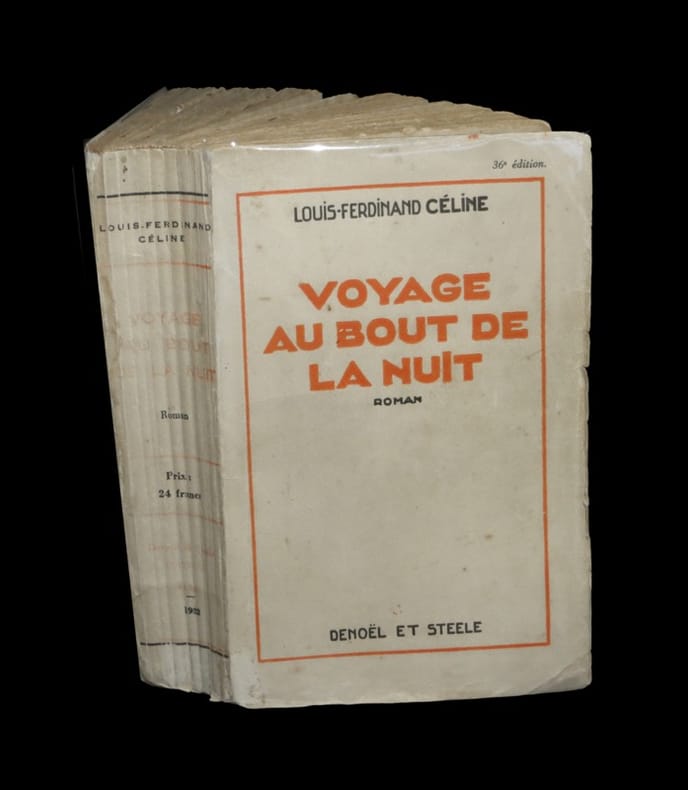 ''Réimpression en offset par l'Imprimerie française de l'édition'' parue à la date de l'originale. L'ouvrage recèle bien le rare catalogue éditeur in fine imprimé sur papier vert d'eau. Pour ce premier roman, Céline s'inspira principalement de son expérience personnelle. Il avait en effet participé à la Première Guerre mondiale et celle-ci lui révéla l'absurdité du monde, allant même jusqu'à la qualifier «d'abattoir international en folie». Céline expose ainsi ce qui est pour lui la seule façon raisonnable de résister à une telle folie: la lâcheté. Il est hostile à toute forme d'héroïsme, celui-là même qui va de pair avec la guerre. Pour lui, la guerre ne fait que présenter le monde sous la forme d'un gant, mais un gant que l'on aurait retourné, et dont on verrait l'intérieur, ce qui amène à la trame fondamentale du livre: la pourriture et sa mise en évidence... De Benoist, Bibliographie internationale de l'oeuvre de Céline, B4 (pour l'édition originale millésimée octobre 1932). Quelques piqûres éparses sur les couvertures. Petit manque angulaire au second plat. Dos passé. Papier légèrement oxydé présentant en outre quelques rousseurs. Discrète cerne en marge supérieure des derniers cahiers. Condition néanmoins satisfaisante.