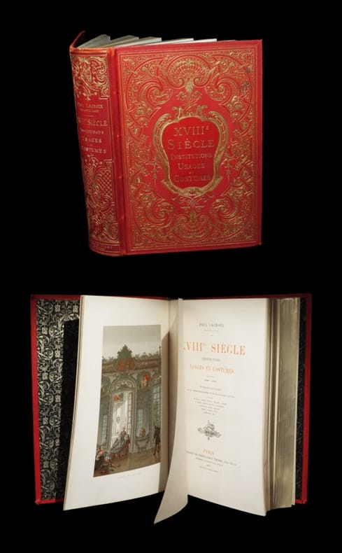 Spectaculaire réalisation ; ici revêtue de sa superbe reliure éditeur. L'ouvrage s'agrémente de 350 figures dans le texte ainsi que de superbes planches en chromolithographies avec rehauts dorés. ''L'auteur propose ici une sorte d'histoire descriptive et pittoresque qui semble répondre au besoin de légitime curiosité, qui est un des caractères de l'époque actuelle, en faisant revivre devant nous un passé qu'on ne saurait trop bien connaître sous toutes ses faces pour éclairer et juger le présent''. Colas I, Bibliographie du costume, 1704 - Vicaire III, Manuel de l'amateur de livres du XIXème, 851 (pour une édition de 1874) - Brunet VI, Manuel du libraire et de l'amateur de livres, 740. Angles et coiffes élimés. Quelques très rares autant que discrètes rousseurs dans le texte. Du reste, très belle condition.