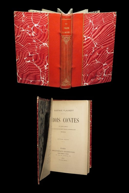 Exemplaire revêtu d'une délicate reliure du temps signée Flammarion-Vaillant. ''Editeur, Flammarion avait un atelier de reliure-main à Paris qui fut crée en 1909 et resta en activité jusqu'en 1956. Les reliures signées Flammarion et Vaillant sortent de cet atelier''. (in Fléty). ''A la suite des deuils qui frappèrent Flaubert dans les années précédentes et de grosses fatigues qu'avait coûté la composition de la version définitive de Saint-Antoine, le romancier avait cru trouver une diversion en préparant Bouvart et Pécuchet. Lassé par l'écriture de ce dernier, il accepte alors l'invitation de son ami, le naturaliste Pouchet, et part pour Concarneau. Là, pour se récréer, il reprend en septembre 1875 un vieux projet datant de mai 1846, La Légende de Saint Julien l'Hospitalier, déjà ébauchée en 1856, après Madame Bovary. Ruiné et tandis que ses amis multiplient leurs efforts pour lui procurer un poste qui puisse assurer son existence, il rédige ce conte. Puis, à Croisset, Un coeur simple. Et enfin Hérodias, qu'il achève le 3 février 1877. Mais s'il reçut trois mille franscs pour la publication de ces contes, Flaubert a éprouvé une perte fort dure, celle de George Sand, pour qu'il il était justement en train d'écrire ce Coeur simple.'' (in Dumesnil). ''Pour Samuel de Sacy, ces Trois contes résument tout l'art flaubertien: Un cœur simple, c'est le psychologue intimiste; Hérodias, c'est l'historien, le peintre ; Saint Julien, l'amateur de fables et de surnaturel.'' Fléty, Dictionnaire des relieurs français, p. 71. Angles élimés. Papier oxydé présentant en outre de très discrètes rousseurs. Nonobstant, belle condition.