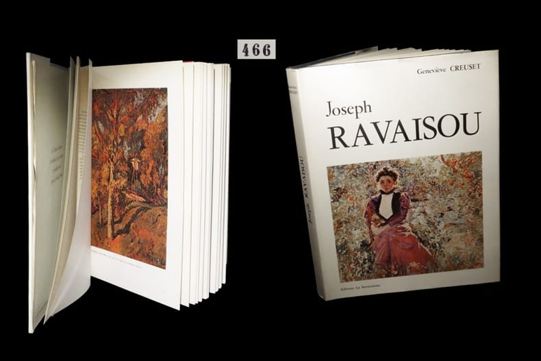 Un des exemplaires du tirage numéroté. L'ouvrage s'agrémente d'une abondante iconographie et se propose de décrire près de 300 des oeuvres répertoriées de l'artiste. ''Pour suivre, comme il convient, l'ascension de Ravaisou vers la maîtrise, depuis ses premières huiles déjà si rayonnantes jusqu'à ses dernières aquarelles d'une virtuosité, d'une fraîcheur et d'une poésie extraordinaires, rien ne pouvait plus opportunément venir à l'heure que cette présentation, aussi exhaustive que possible, de son oeuvre''. Coiffe supérieure de la jaquette très légèrement élimée. Du reste, très belle condition.
